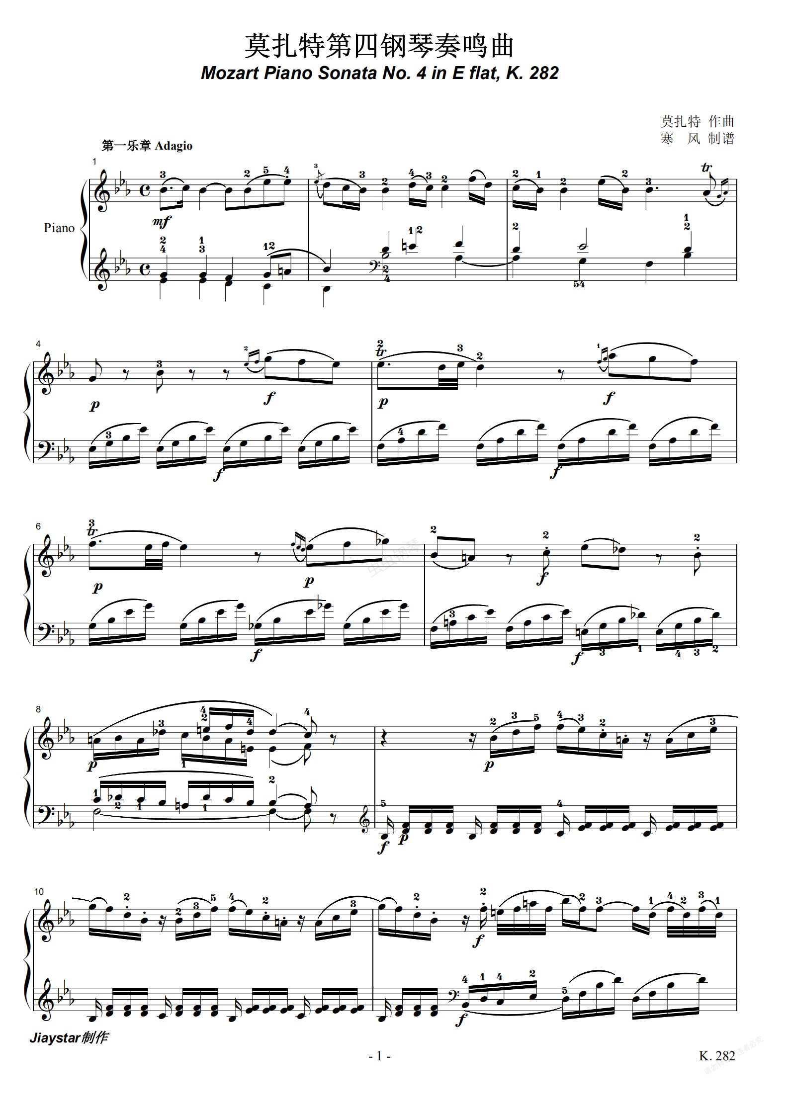 钢琴谱:莫扎特降E大调第四钢琴奏鸣曲K.282