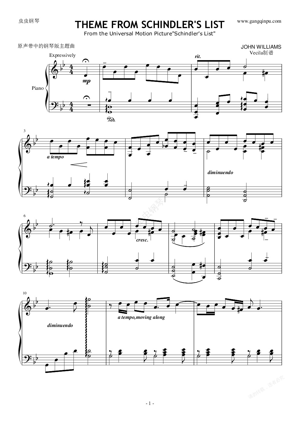 钢琴谱:辛德勒的名单-(reprise)(钢琴,原版)