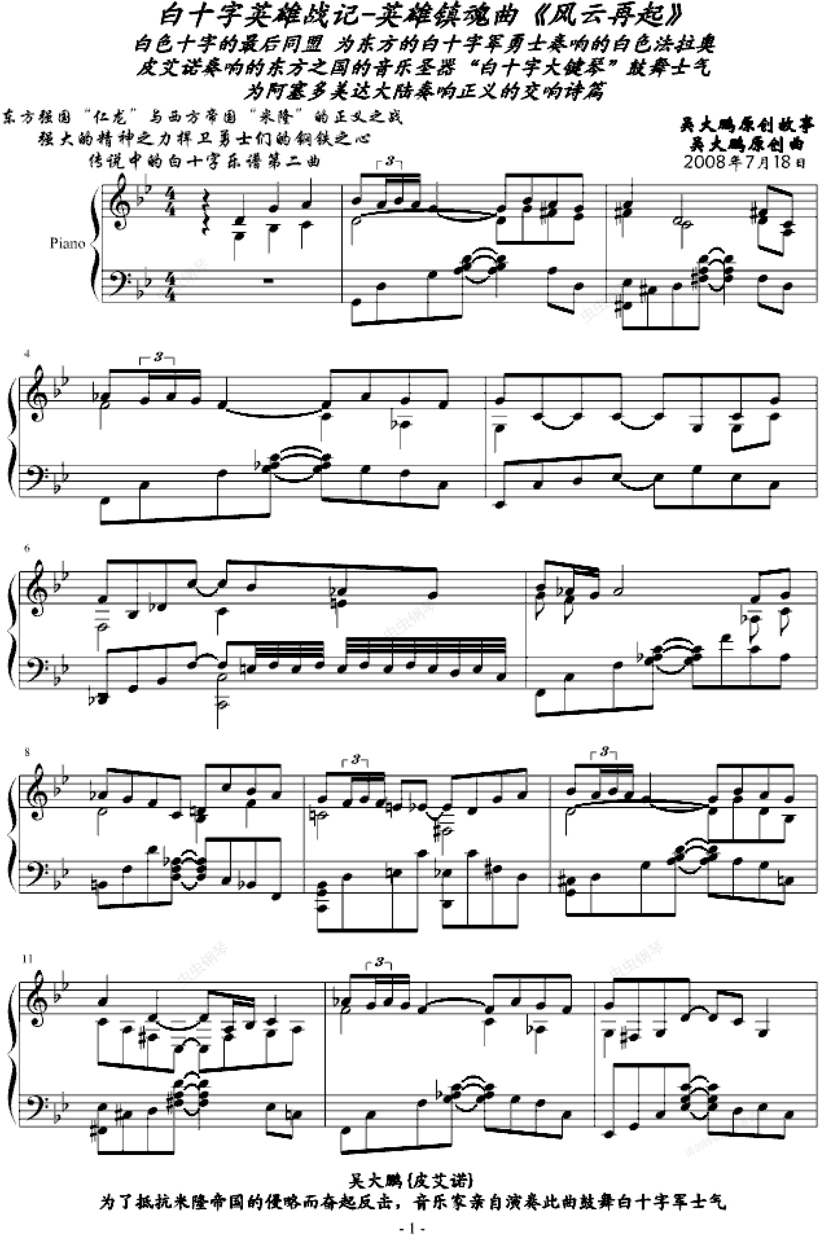 军事帝国米隆在攻占了“罗地塔”王国之后,又相继入侵了东方剩余6国......时光流逝,最终米隆凭借强大的黑暗之力“黑色法拉奥”进一步攻占了“多米索”王国,国王战死,公主“爱丽丝”为保护人民免遭磨难,单独留守,用《天使降临》之歌,抵抗黑暗四天王,与主人公“皮艾诺”一起抵挡黑色法拉奥的强力冲击,激战中,白十字大键琴遭到史无前例的破坏,皮艾诺为了保护爱丽丝被黑暗四天王的黑暗音乐撕碎了乐感和听觉,成为废人,幸好东方的强国“仁龙”派遣的军队赶到,“仁龙”的天才乐师“丸灵儿”公主用上古的神器“哈朴”{传说的竖琴}救活了皮艾诺,并爱上皮艾诺,但是皮艾诺心中深爱着爱丽丝,对爱情的忠贞感动了的“丸灵儿”毅然决定亲自说服自己的父皇与“多米索”结为最后的同盟,以上古留传下来的白十字大键琴作为最后的抵抗神器,并组织起一支为正义而战的勇士军团,称之为“白十字英雄军团”,抵抗随后而来的米隆大军,在激烈的战斗之前,尚未恢复的皮艾诺为了鼓舞士气,坐镇“龙仁”的都城音乐圣坛里面,弹奏最后的白十字大键琴,来对抗黑暗四天王的黑色法拉奥的精神攻击,保护白十字军的英雄们,这是战前的最后篇章,传说中的第二首白十字乐谱。