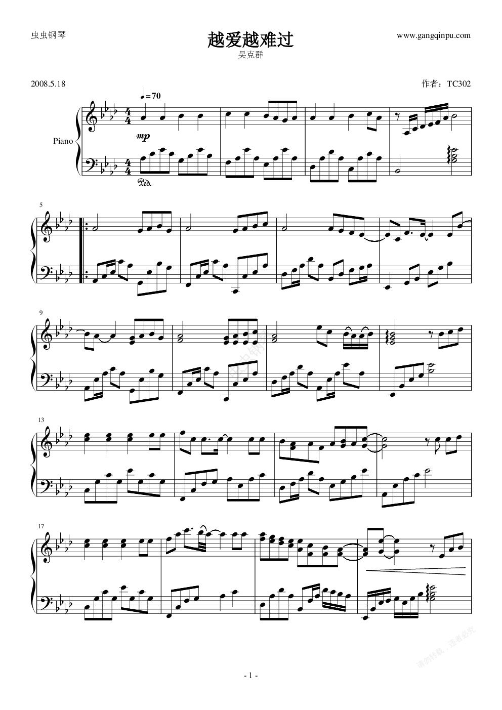 钢琴谱:越爱越难过