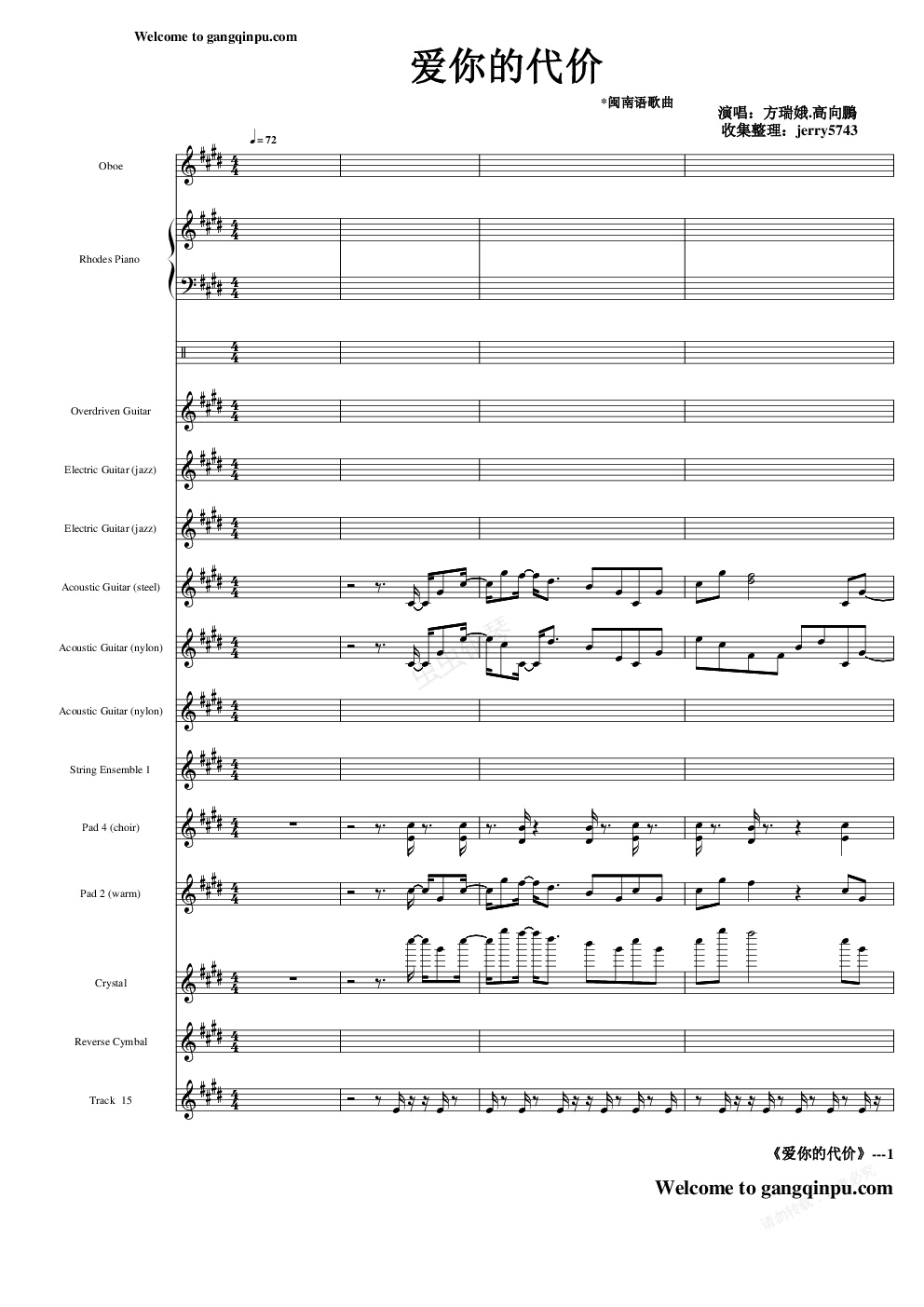 钢琴谱:爱你的代价