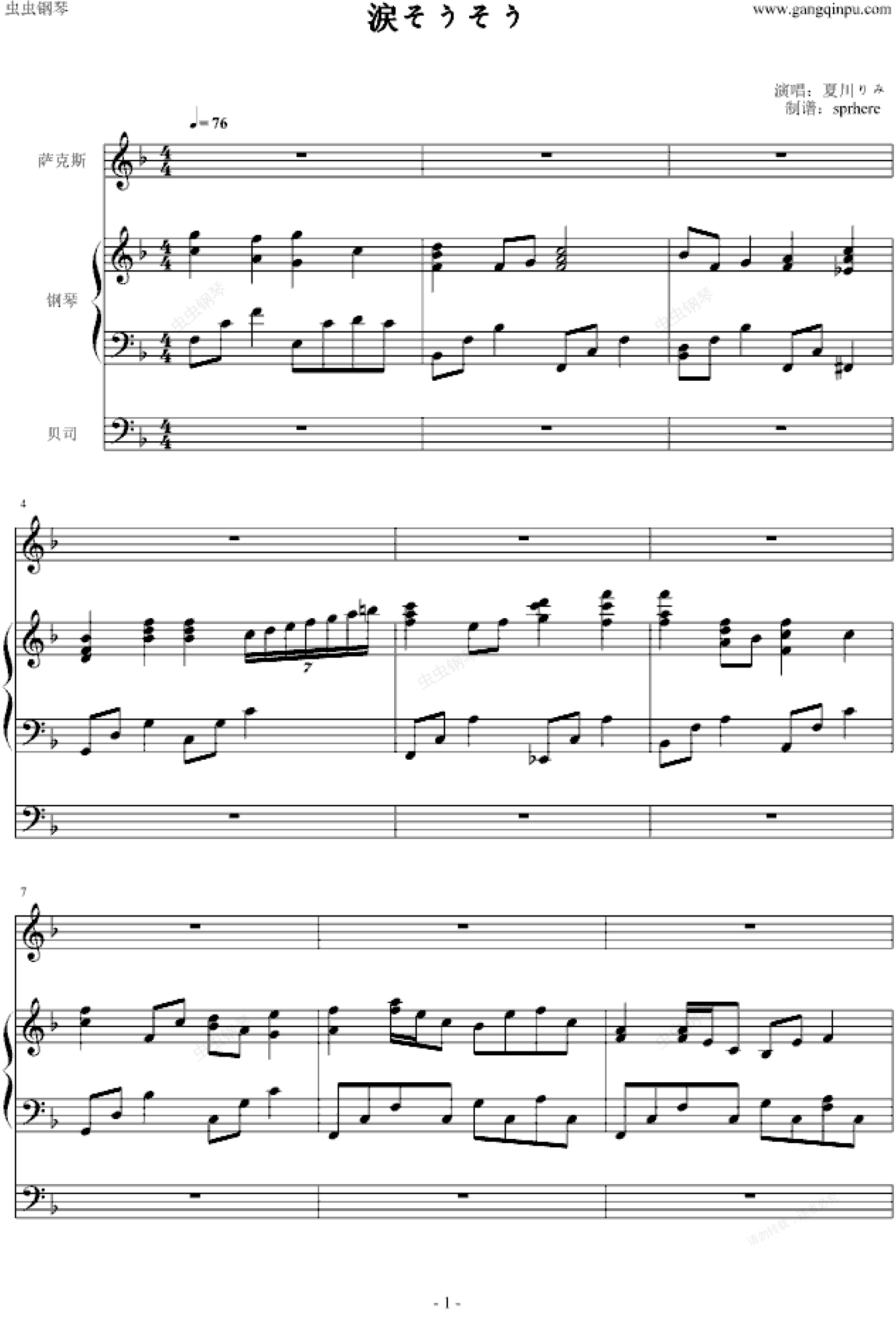 钢琴谱:涙そうそう(泪光闪闪)