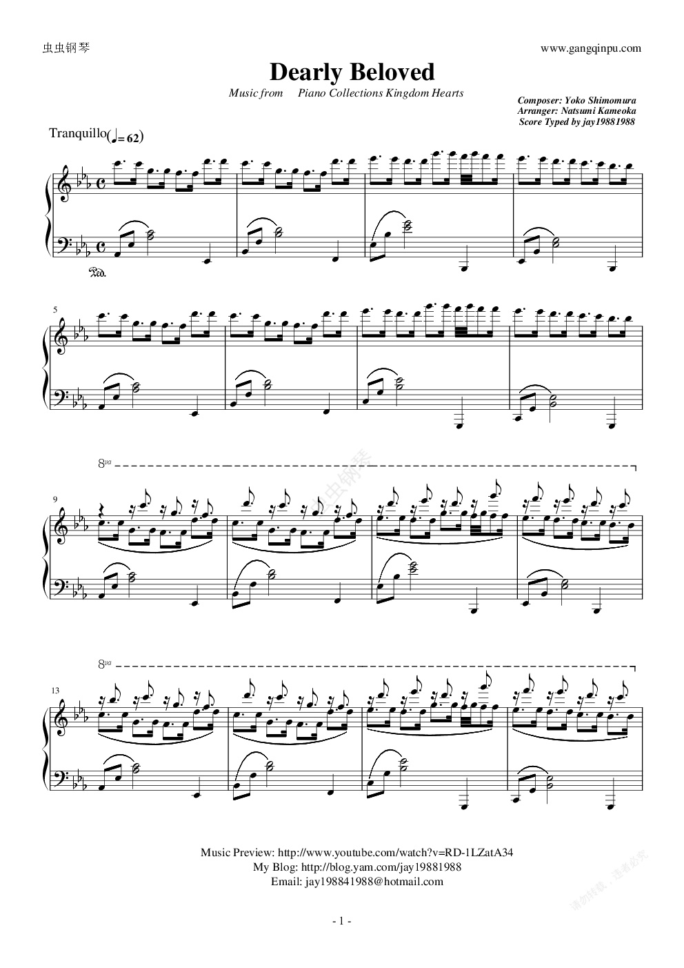 钢琴谱:王国之心2Dearly Beloved