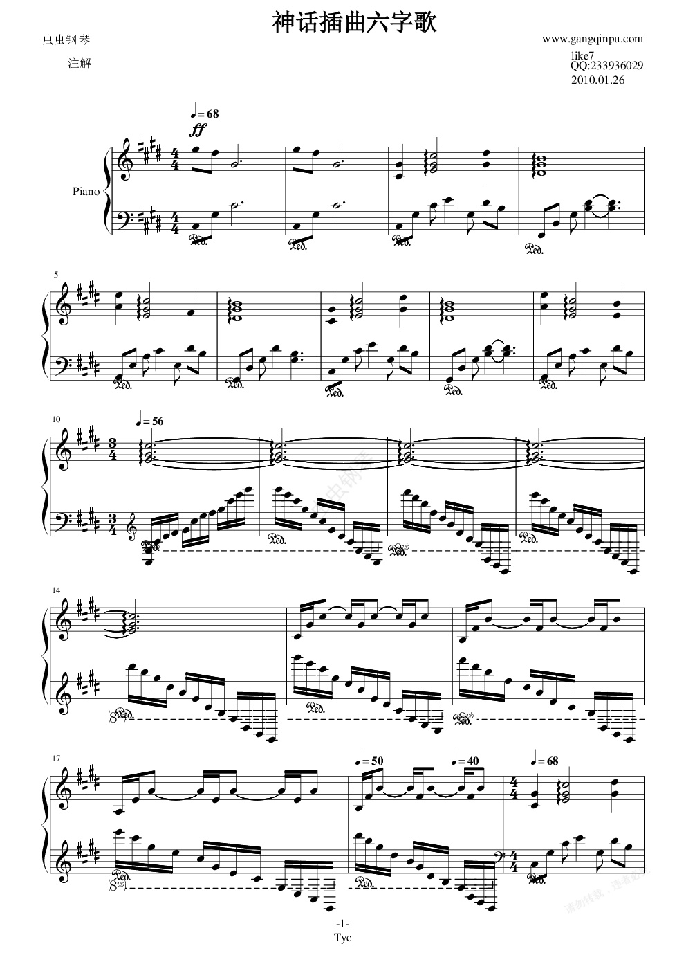 钢琴谱:神话插曲六字歌