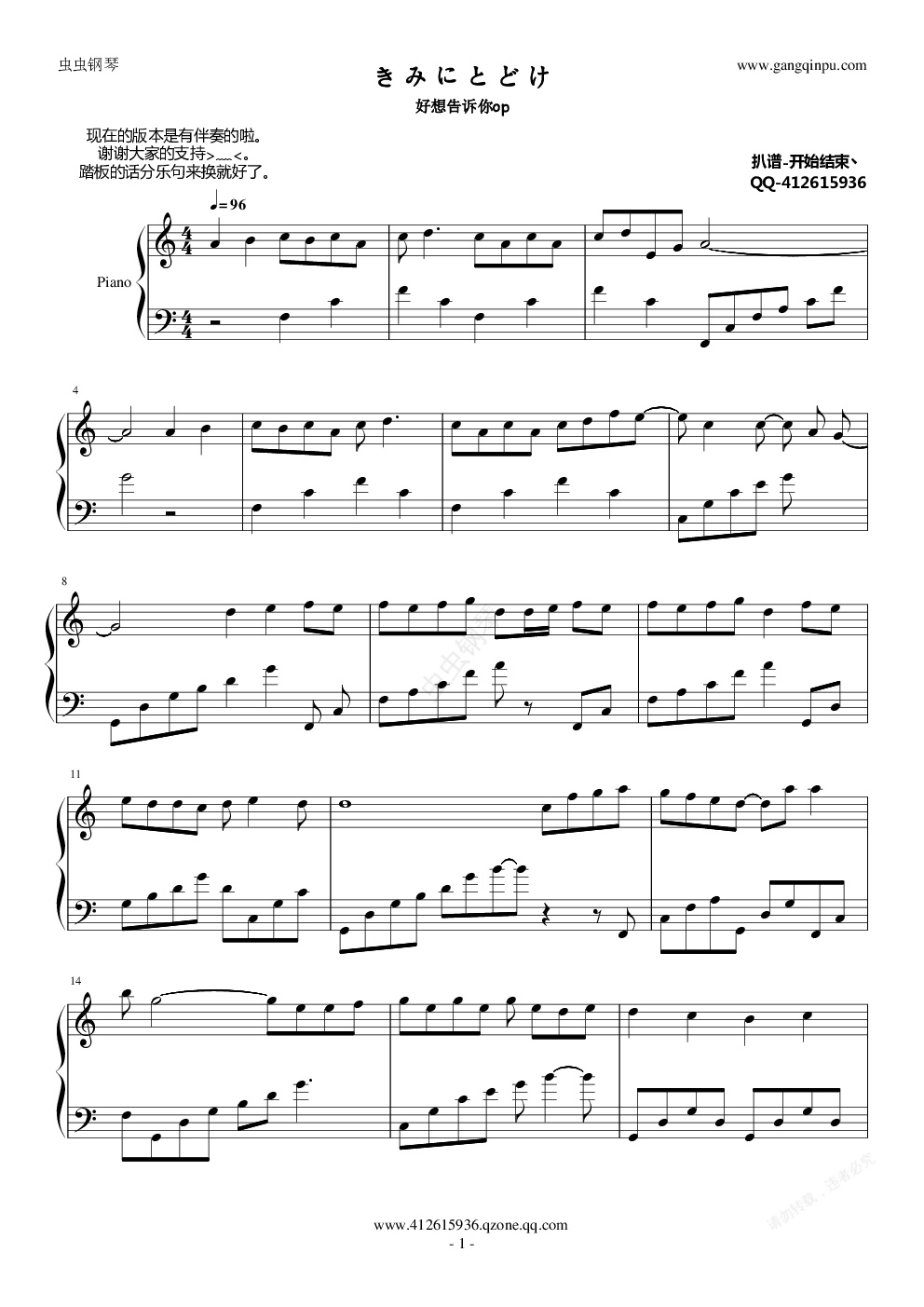 钢琴谱:好想告诉你op完整简单版(君届)。