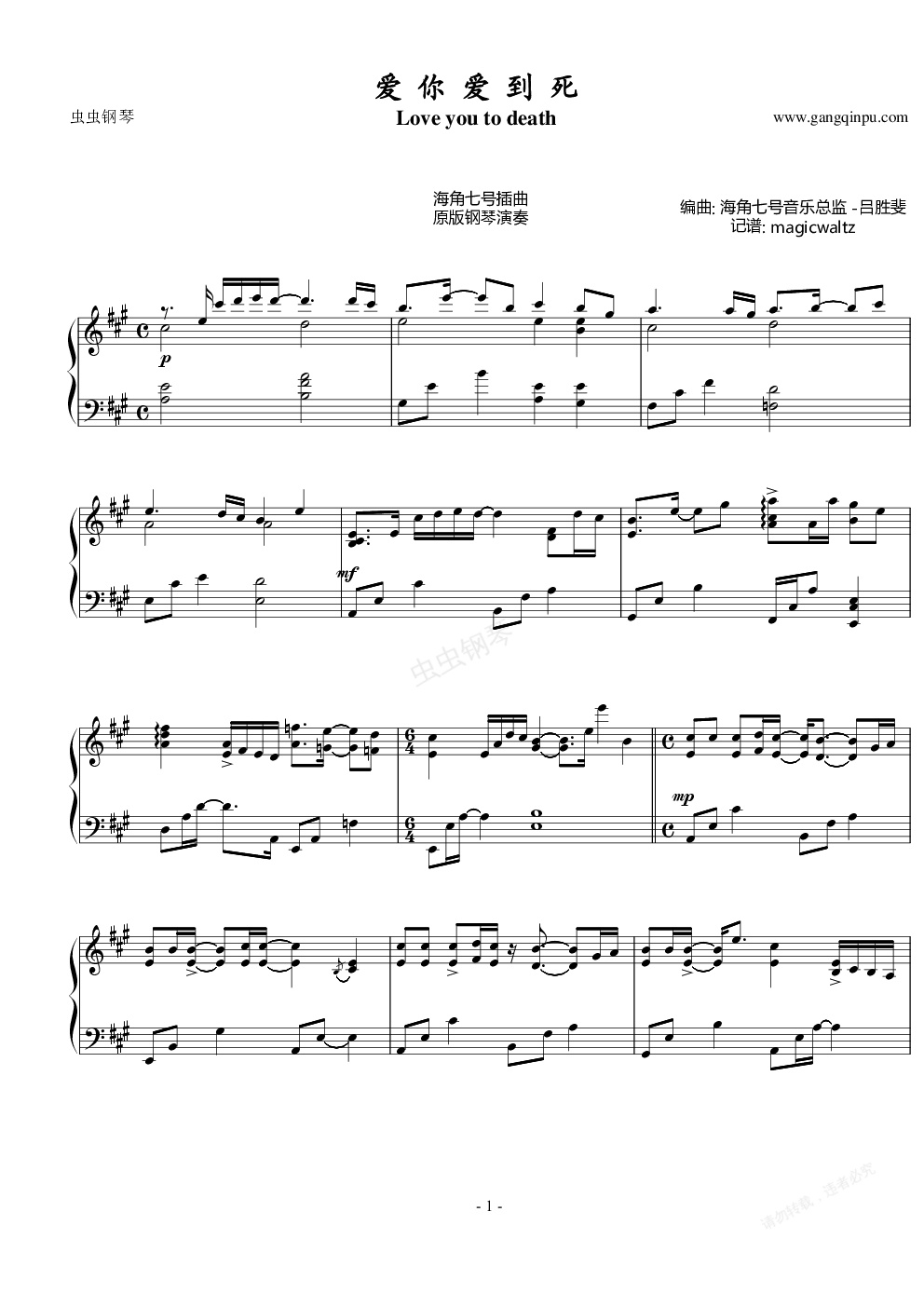 钢琴谱:爱你爱到死 钢琴原版(海角七号插曲)