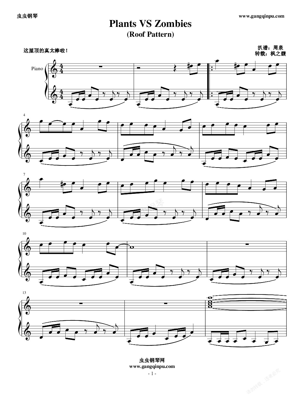 钢琴谱:植物大战僵尸(屋顶音乐)