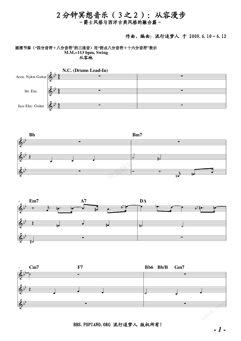 注:只今VSTi缺乏,无奈选用声卡默认的GM软波表音色,音响效果较劣,还望凑合。两个附件MP3,分别用不同的音色库录制,第一个部分使用了  Jazz and Big Band 音源,第二个全部使用GM软波表音色。请大家选择合适的MP3预览。