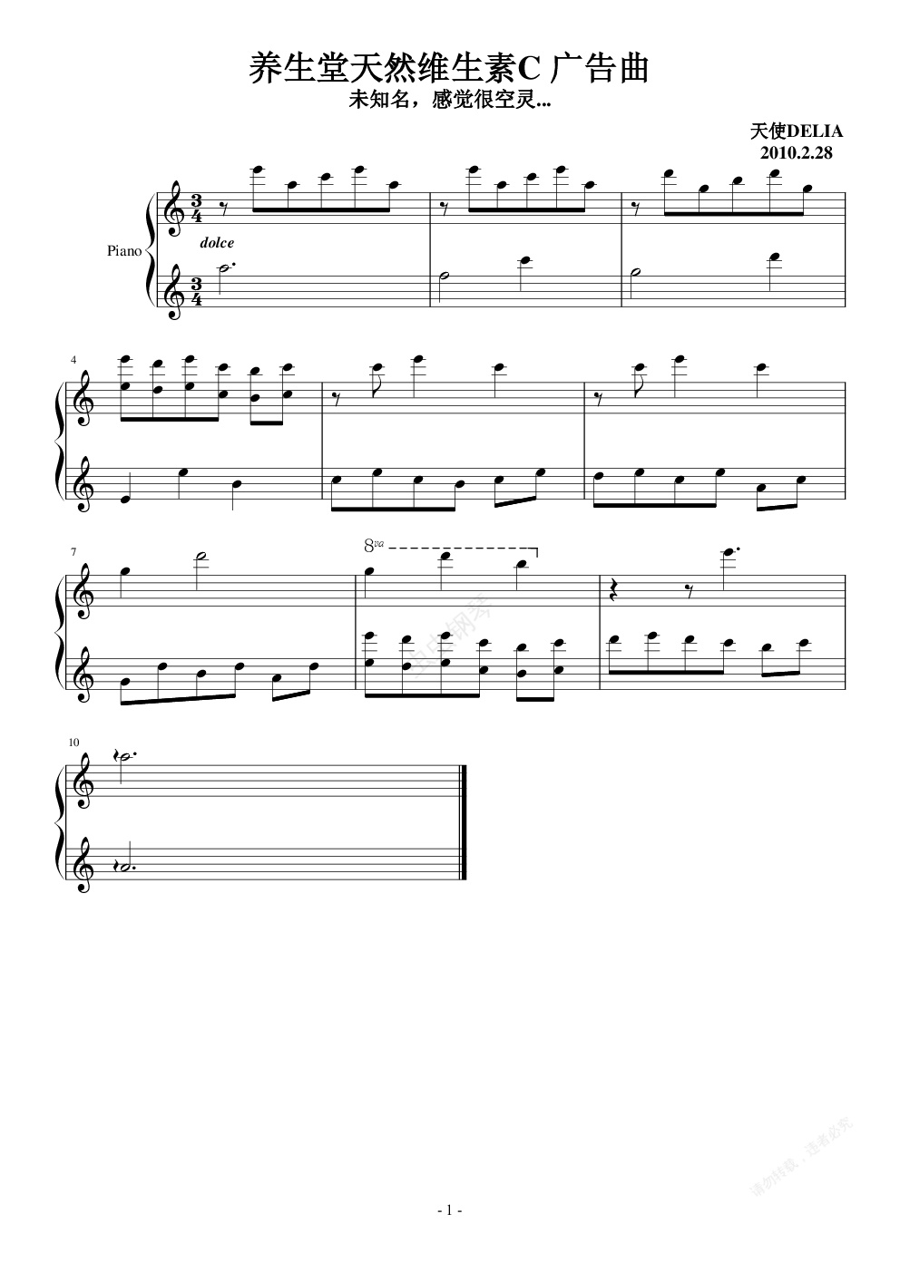 钢琴谱:养生堂空灵广告歌