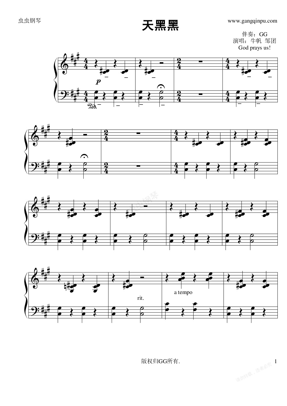 钢琴谱:天黑黑