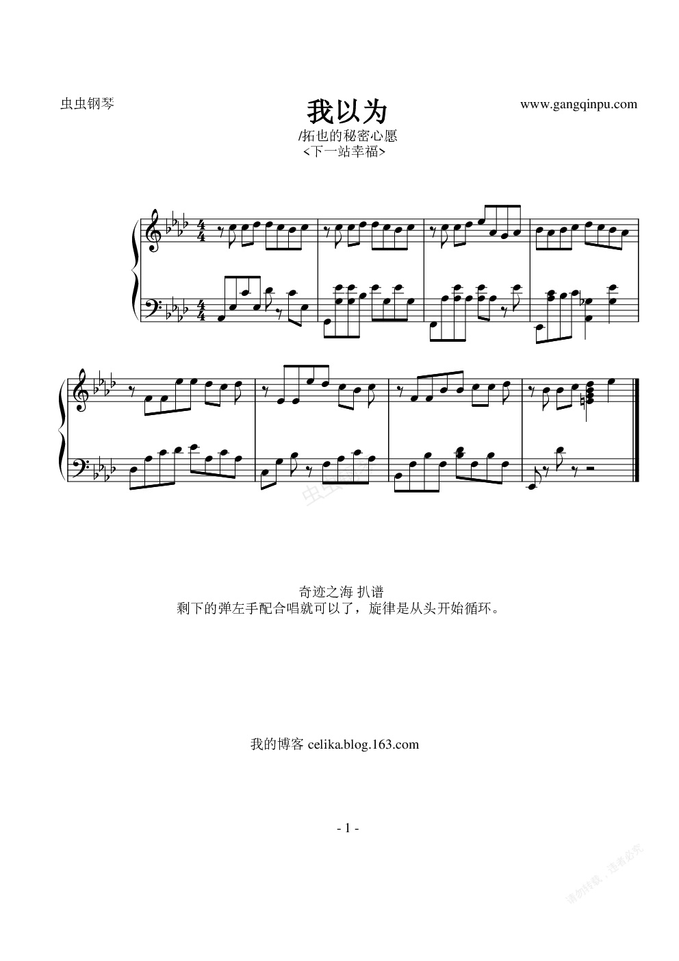 钢琴谱:下一站幸福 我以为 拓也的秘密心愿