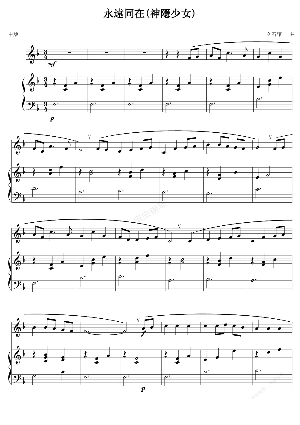 钢琴谱:神隐少女片尾曲-简单版