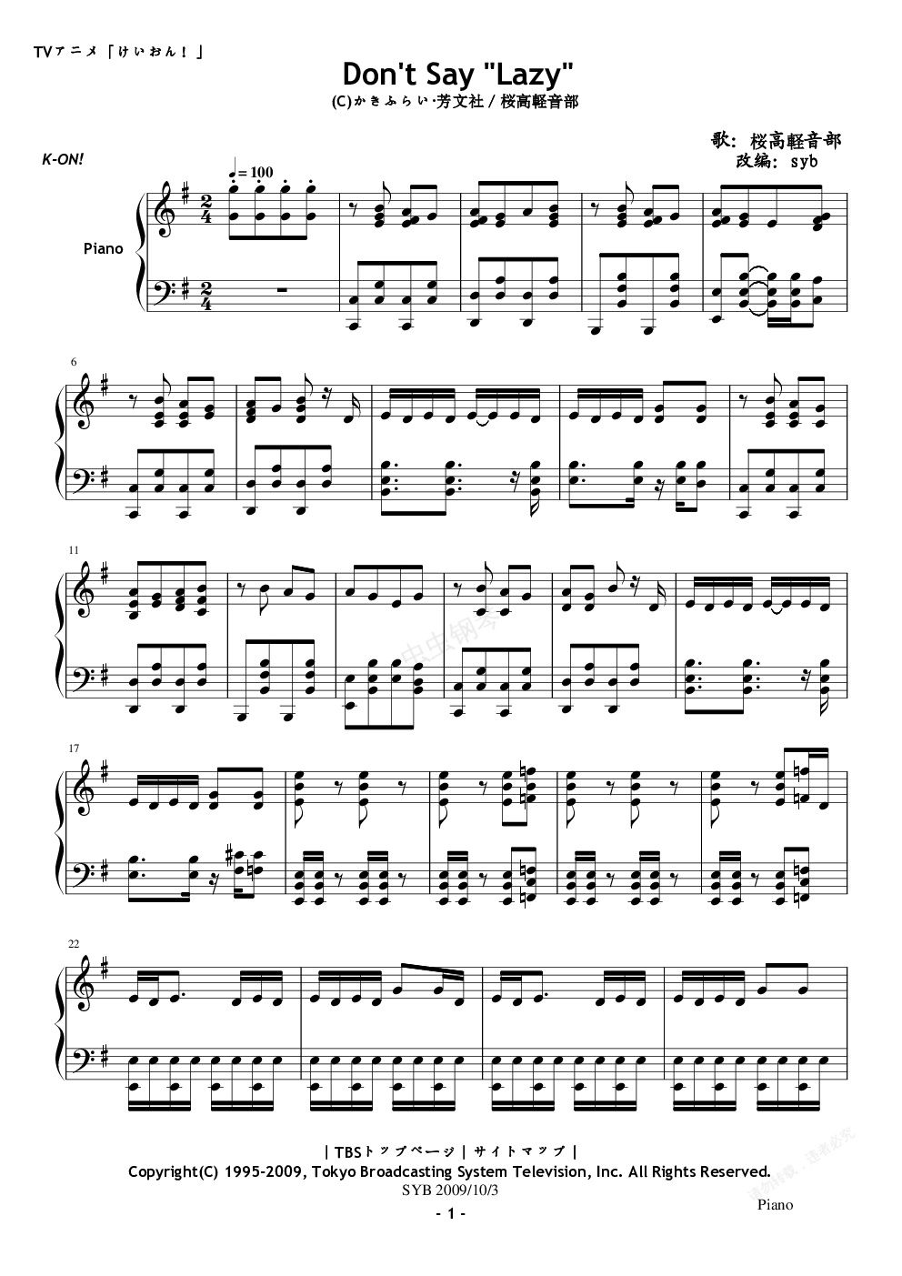 钢琴谱:K-ON! don't say lazy-syb