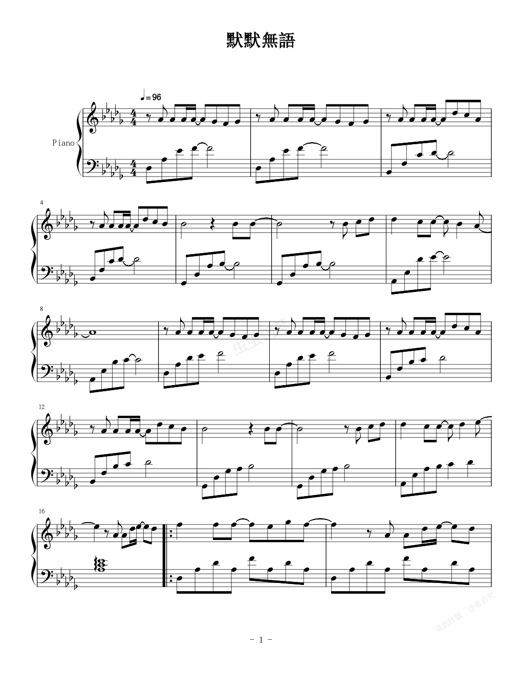 钢琴谱:默默无语(原来是美男)