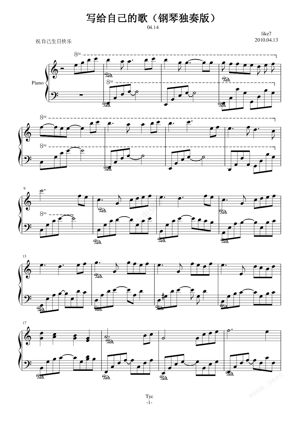 钢琴谱:写给自己的歌(钢琴独奏版)