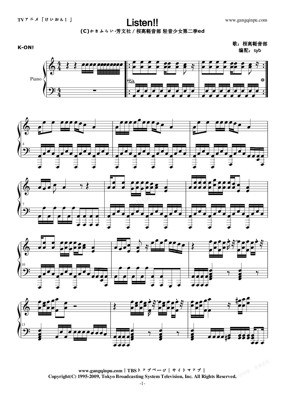 钢琴谱:K-ON!第二季ed listen!!