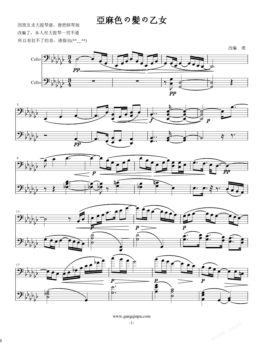 钢琴谱:亚麻色头发的少女(大提琴合奏)