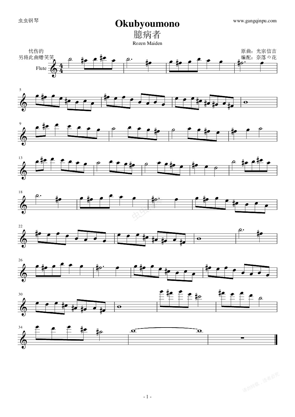 钢琴谱:长笛独奏《臆病者》【《蔷薇少女》插曲】