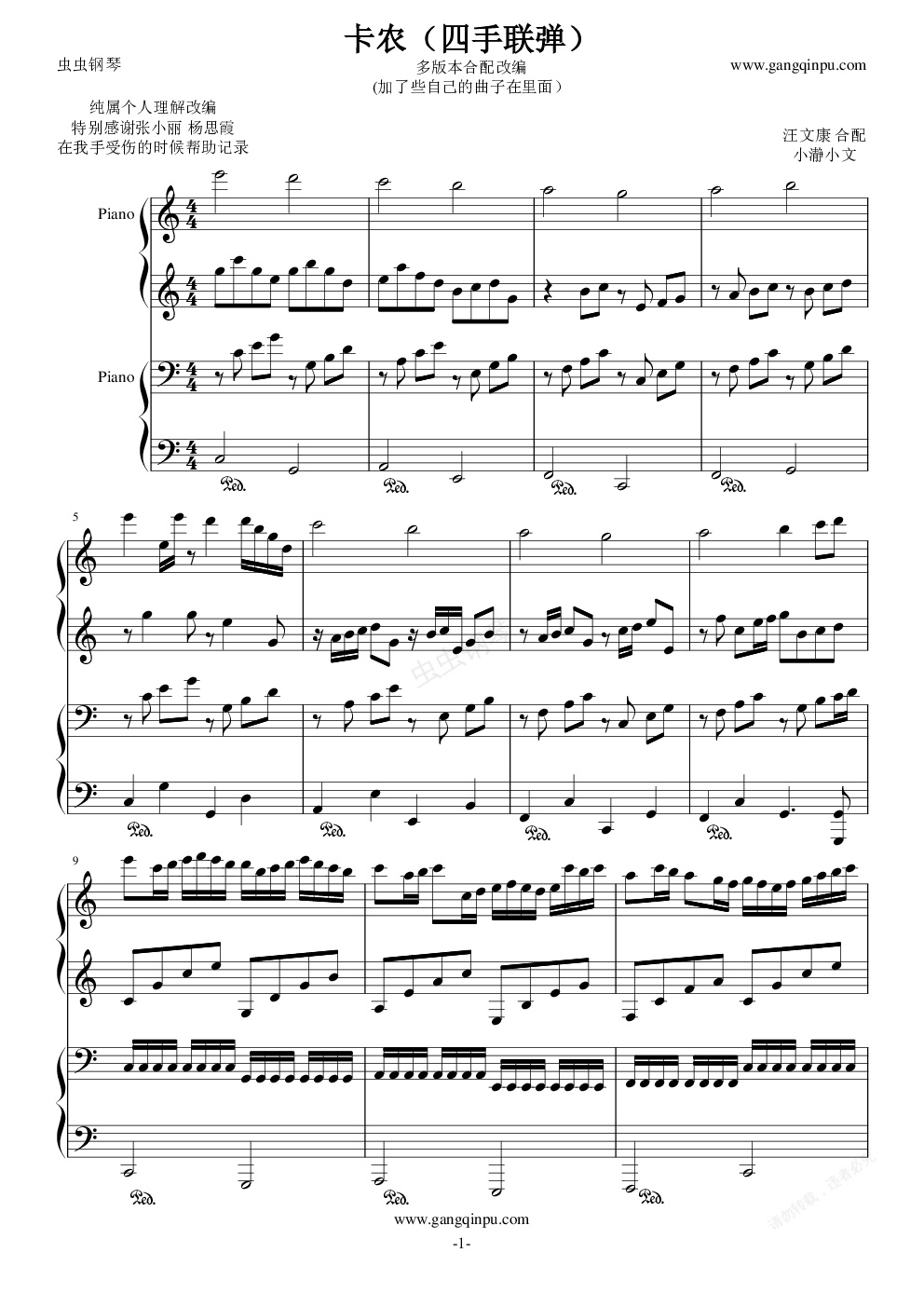 钢琴谱:卡农(四手联弹)