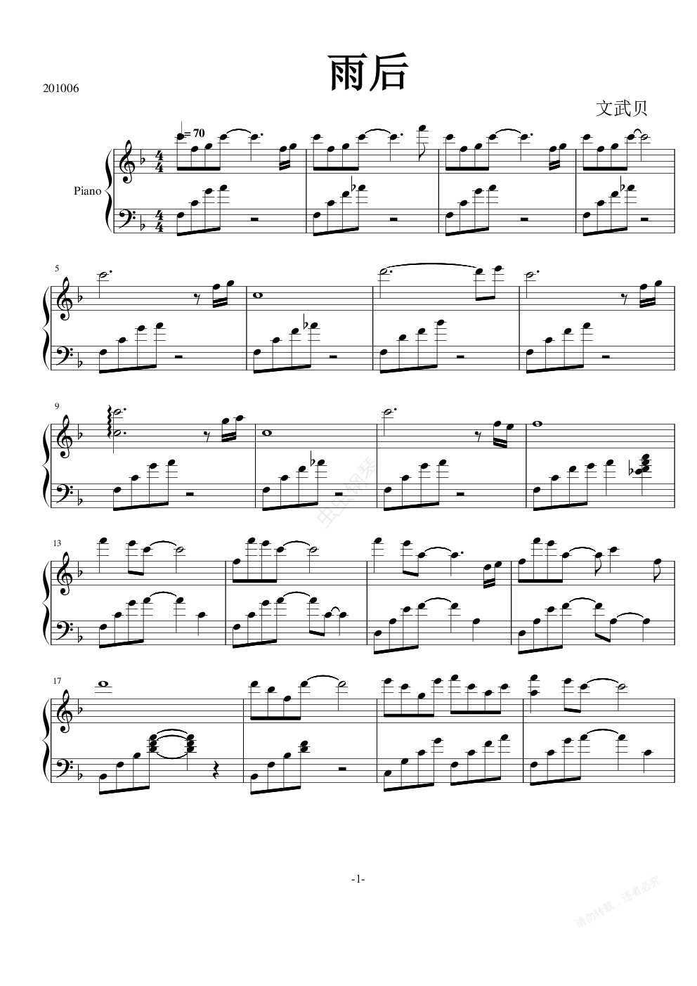 雨,停了, 空气弥漫着泥土的芳香, 雨,停了, 绿叶被洗得透亮, 雨,停了, 鸟儿在快活地歌唱, 雨,停了, 我用音乐表达欢畅……