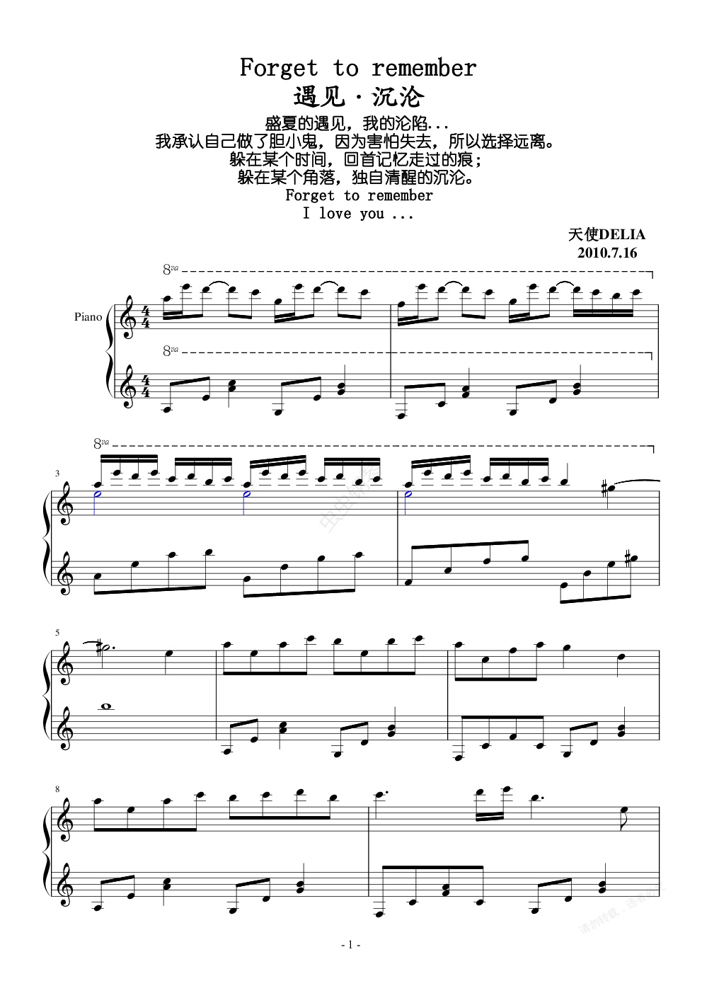 钢琴谱:遇见·沉沦 Forget to remember
