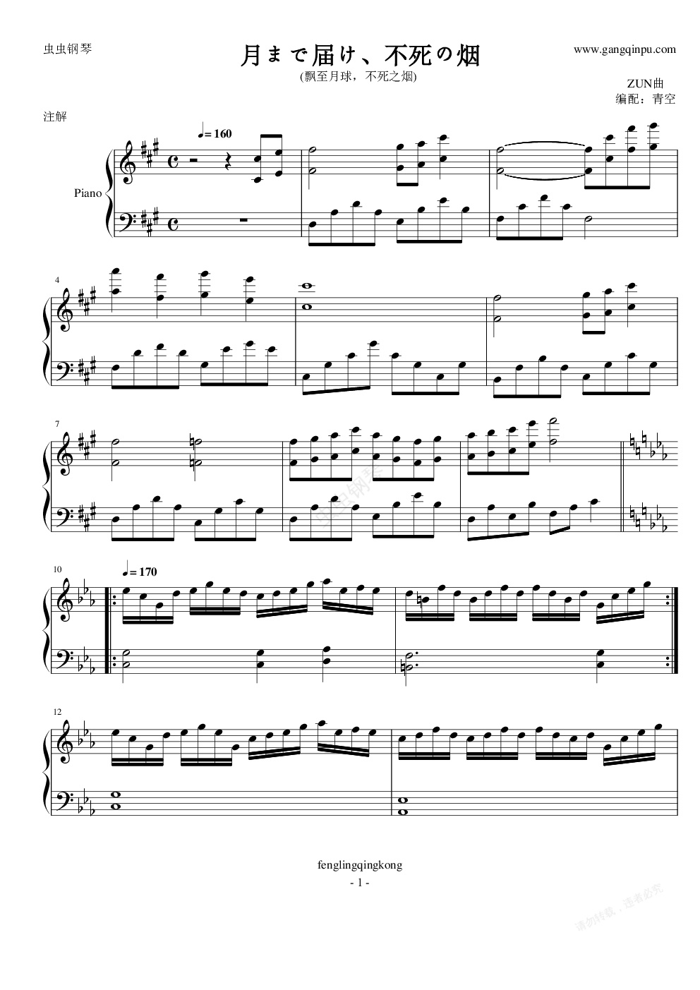 钢琴谱:【东方永夜抄】月まで届け、不死の烟