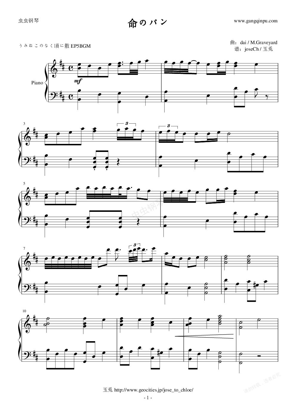 钢琴谱:命のパン