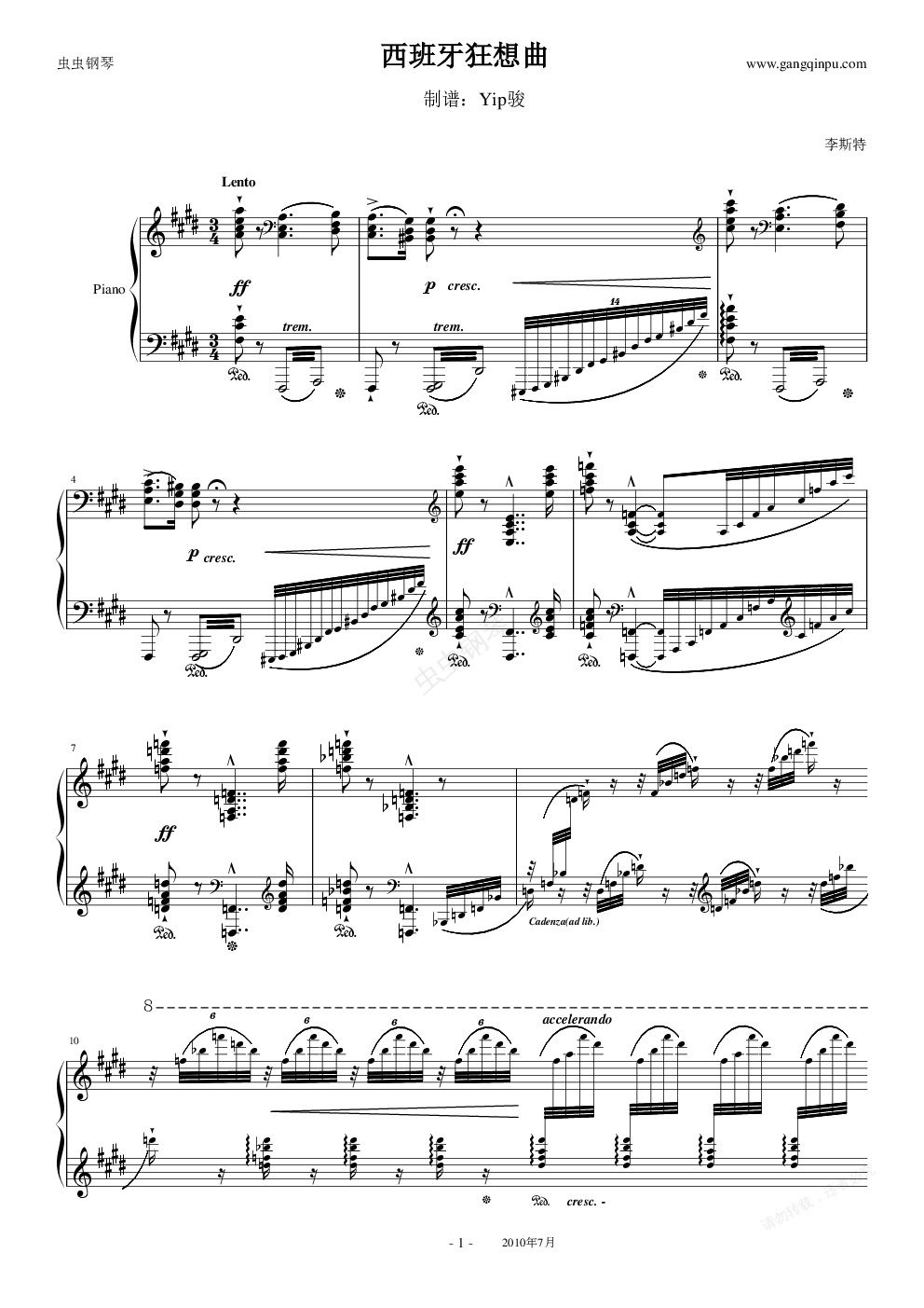 李斯特除了19首《匈牙利狂想曲》之外,还写有一首《西班牙狂想曲》。而这首《西狂》在他的所有狂想曲里,无疑是篇幅最长、难度最大的一首之一,足足有37面乐谱,我压缩了一下,压到了24页。技巧方面,这首作品可以说是一首从头难到尾的曲子,钢琴技巧层出不穷,让人眼花缭乱,应接不暇!有心人不妨留意一下,24页的乐谱里,到底包含了多少恐怖的技巧~本人勉强弹过一下这个曲子,感觉里面的双音最难。虽然这个技巧不是很显眼,却非常要命。尤其中间右手那一大串快速的双音,如果手指没有极高的独立性恐怕很难弹得干净流利~像我这种菜鸟弹出来永远就是磕磕碰碰的效果……