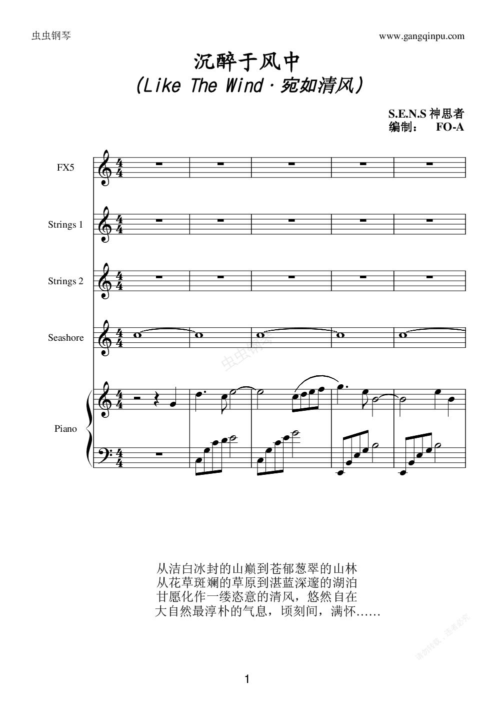 这是神思者的《Like The Wind》,译作《沉醉于风中》或者《宛如清风》,我在虫钢上上传的第一份曲谱就是这个,现在我把它编成多音效形式的总谱,而钢琴部分没有改变~~这是我很喜欢的一首曲,同时我也很喜欢神思者的音乐……