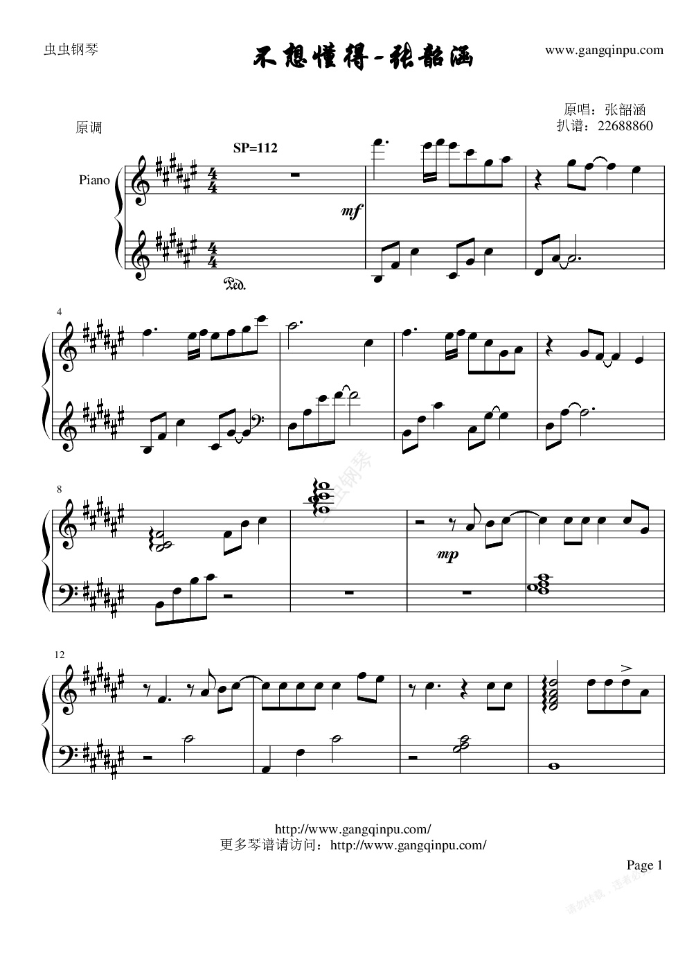 钢琴谱:不想懂得