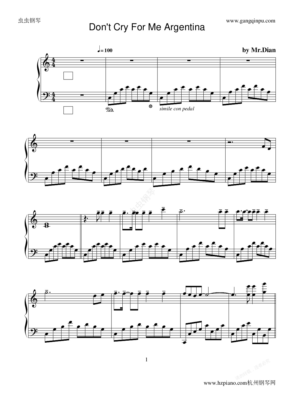 钢琴谱:[奠]演奏版阿根廷别为我哭泣