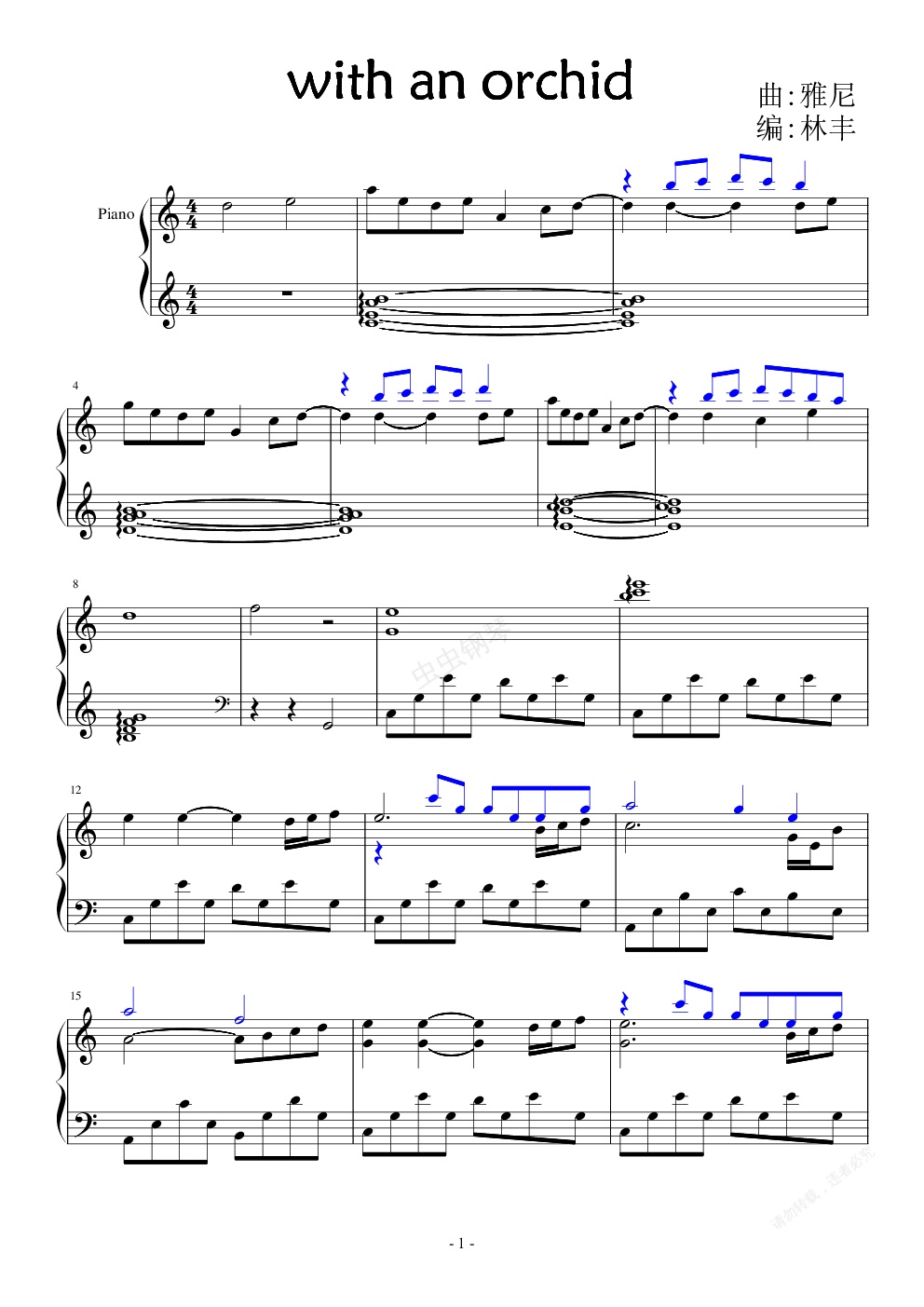 《With An 》是一首非常有名的New Age(新世纪)曲子。由希腊演奏家、作曲家Yanni创作,收录于其专辑《If I Could Tell You》。香港凤凰卫视的凤凰气象站采用它为背景音乐,受到许多人的喜爱。 聆听Yanni的音乐,也许可以找寻到一份久违了的轻松和休闲。音乐飘逸、洒脱,有着海风的清新、清爽,海港的宁静、温馨。《With an 》是雅尼的经典作品之一。这是一首需用心去倾听和感受的曲子,有伤感,有无奈,还有渴望和期盼,听后让人沉醉不能自已。 在这首令人沉醉的曲子声中,依稀可见一个兰花般的清凉而寂寞的世界,漂浮着一天一地的冷艳空气。和兰花在一起。这曲名里没有世俗里包藏的小家碧玉情怀,也没有小情小调的忧伤与做作。只有一股子清新扑面而来,仿佛超越了许多尘土与狂躁,有一点所谓净化灵魂的功效。可爱而可哀的岁月,就这样的流逝,不着痕迹。天空没有痕迹,而鸟儿已经飞过。千江有水千江月,万里无云万里天,还给世界一派清明和寂寞,和兰花在一起,心酸眼亮的那一刻,也许会有片刻的彻悟吧。 飘逸的曲子,清清淡淡,如行云流水般的音律,洁净而从容,在遥远的梦幻里流连,寻找渴望已久的宁静。美丽就在今夜,魂牵梦绕的风景,在尘间,寂静的夜里,停留在此刻。 闭目静听,任思绪随着音乐的律动而随意展开… 感觉自己好像一个人身处一个幽静﹑安祥而漫山遍野都长满了鲜艳可爱的兰花的山腰上,此时此刻,什么都可以不去想,感觉如入梦境,心只专注于身边周围这一大片鲜艳可爱的兰花。此时此刻,只想享受这美丽的大自然所赐予我们的这一切,这是一种多么美妙的境界啊!…