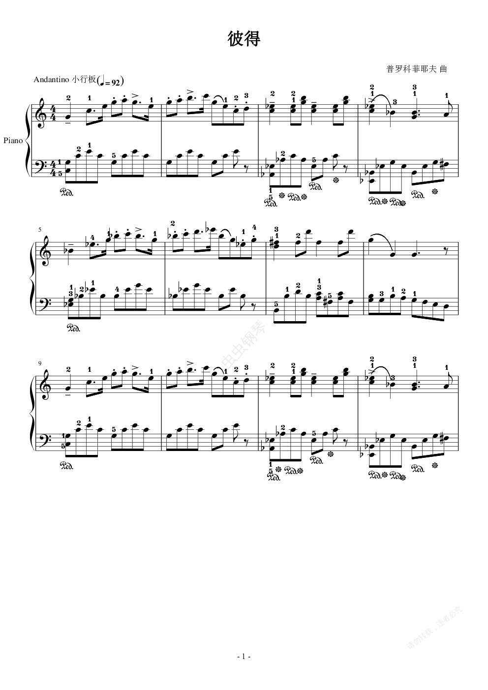 钢琴小曲《彼得》曲式结构为4个乐句的乐段,反复一遍加尾声结束。它利用高音区明亮的音色及轻快、有力的音乐,描写出了天真烂漫、勇敢机智、不畏强暴的少先队员彼得的形象。演奏时要求声音明亮、清晰,左手琶音流畅、有起伏,右手突出重音、跳音,体会乐句的强调、语气,表现出少年儿童的朝气。