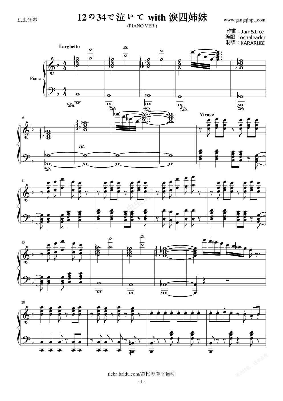 钢琴谱:12の34で泣いて with 涙四姉妹