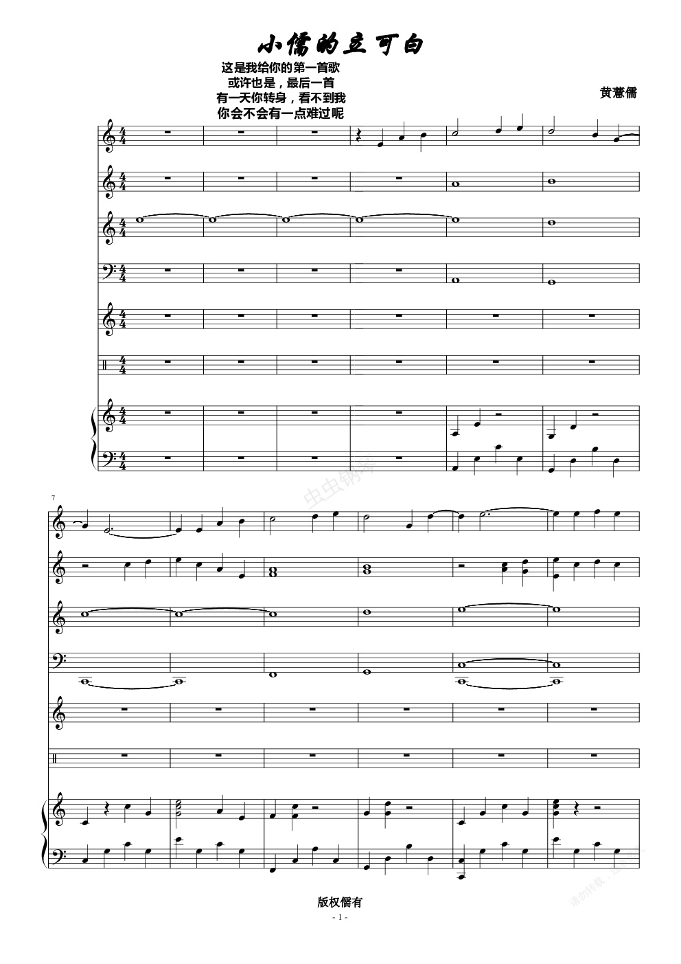 这是一首《小雨写立可白Ⅱ》格式的歌曲,大概是大半年前写的吧,还有一个古筝钢琴合奏版叫《琴声落,半阙歌》,是我们艺术节演奏的,本来我说艺术节的时候把音录下来就上传的,但是由于艺术节那个放在古筝那边的话筒完全没有声音,而且弹钢琴的我根本听不到古筝的声音,结果………………知道有多悲剧了吧……这几天改了一个弦乐版本,改的时候又想起很多事,所以,送给虾头吧,第一首,也许也是最后一首。如果哪天你转身看不到我了,你真的会那么开心吗?
