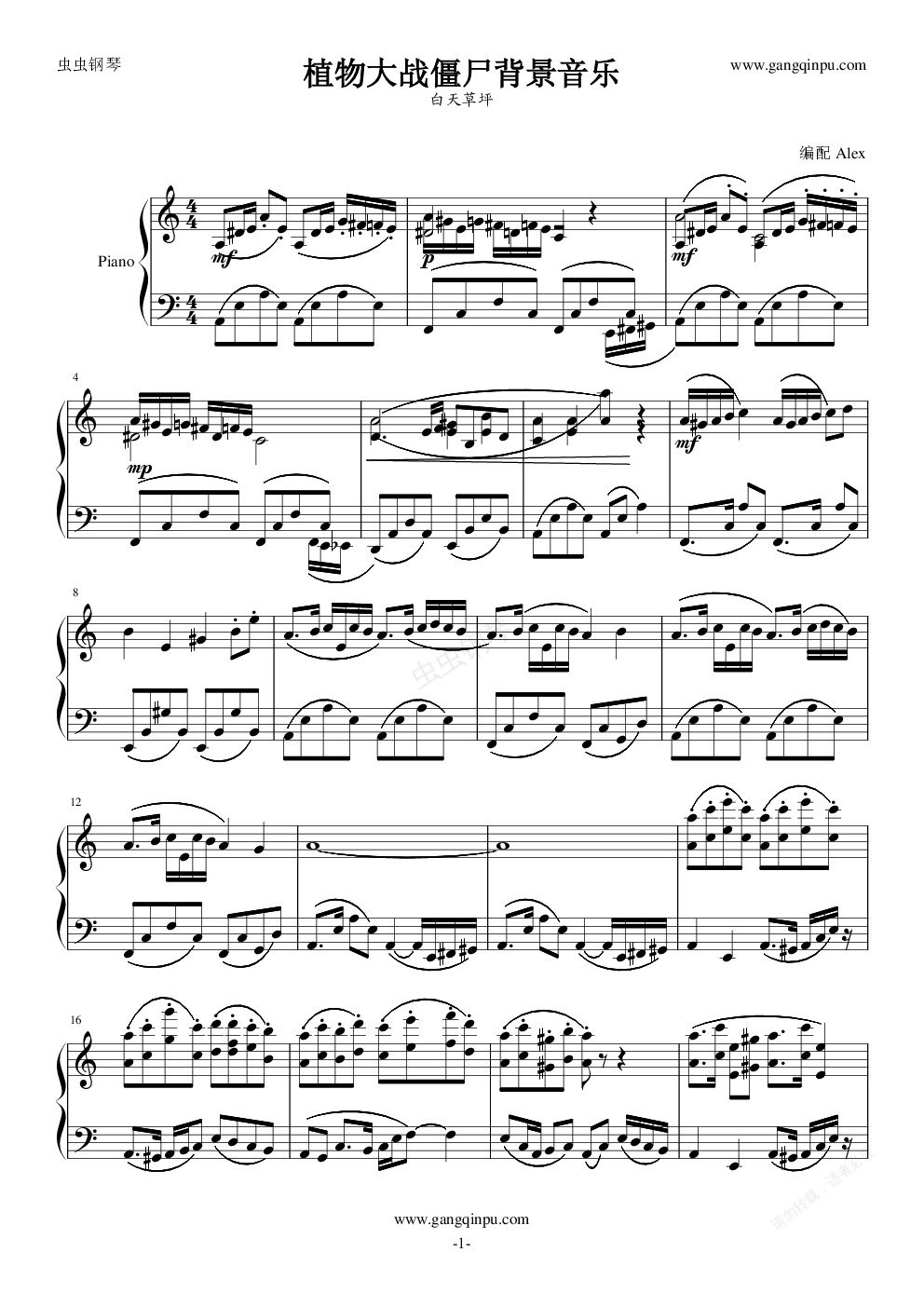 钢琴谱:植物大战僵尸背景音乐白天草坪