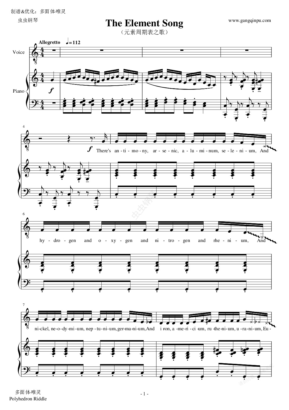 钢琴谱:The Element Song (元素周期表之歌)