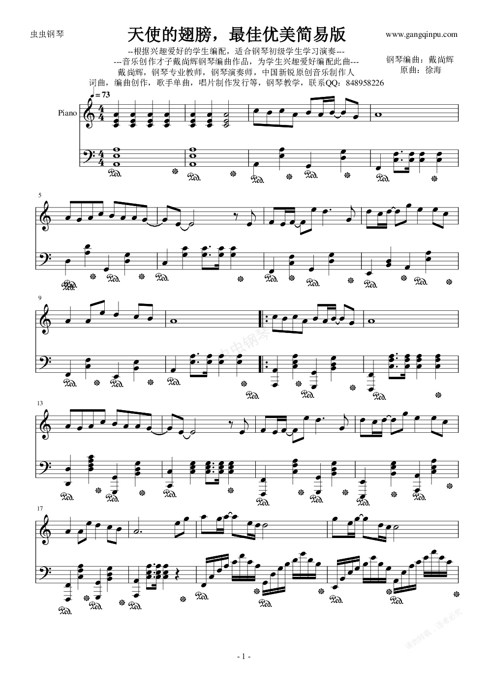 钢琴谱:天使的翅膀 最佳优美简易版
