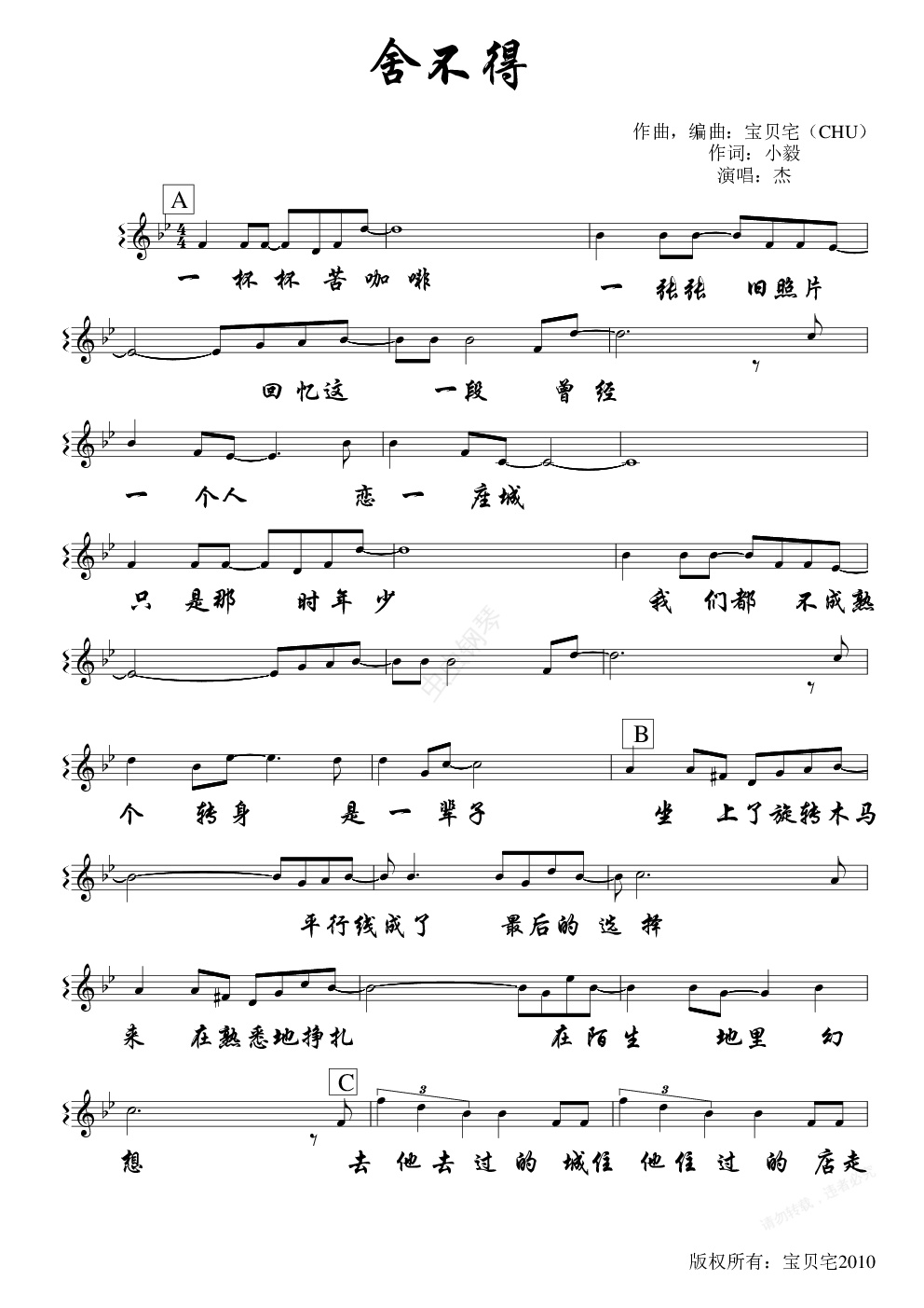 钢琴谱:舍不得(演唱)