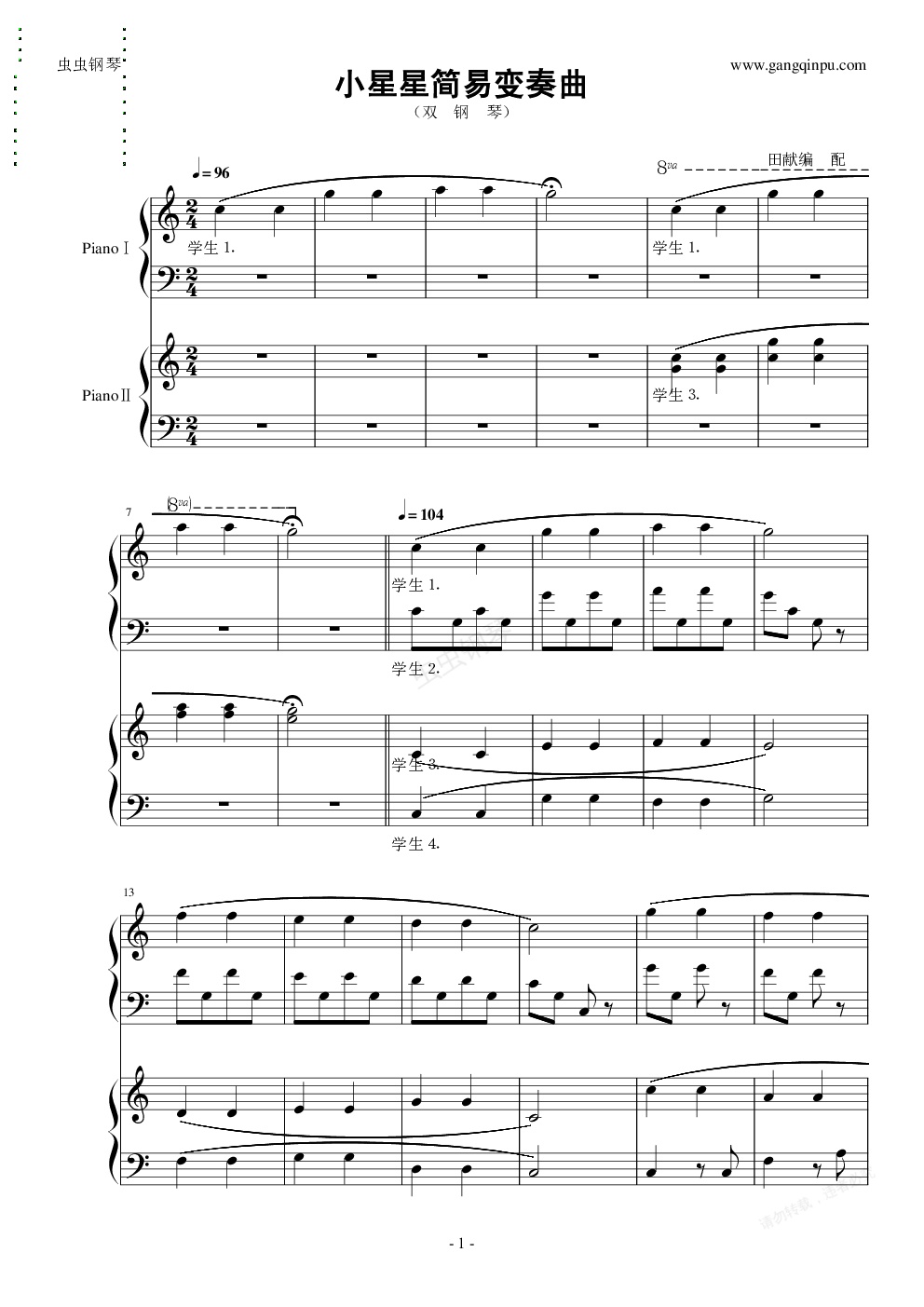 钢琴谱:小星星简易变奏曲(双钢琴)