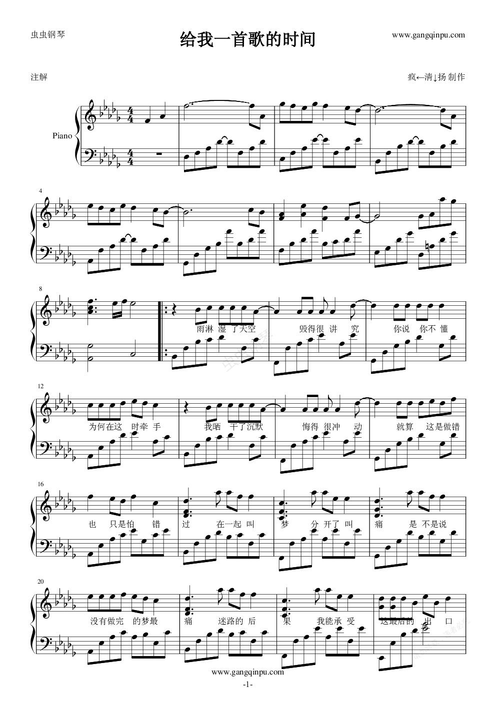 我第一次做有歌词的谱子,可能有些地方不大对,还有这谱子我是根据我的钢琴书上的调子转换的,可能有些旋律会有出入,还请大家理解理解!谢谢~~~~~~(如果虫钢的人没把歌词打出来,不要骂我啊)