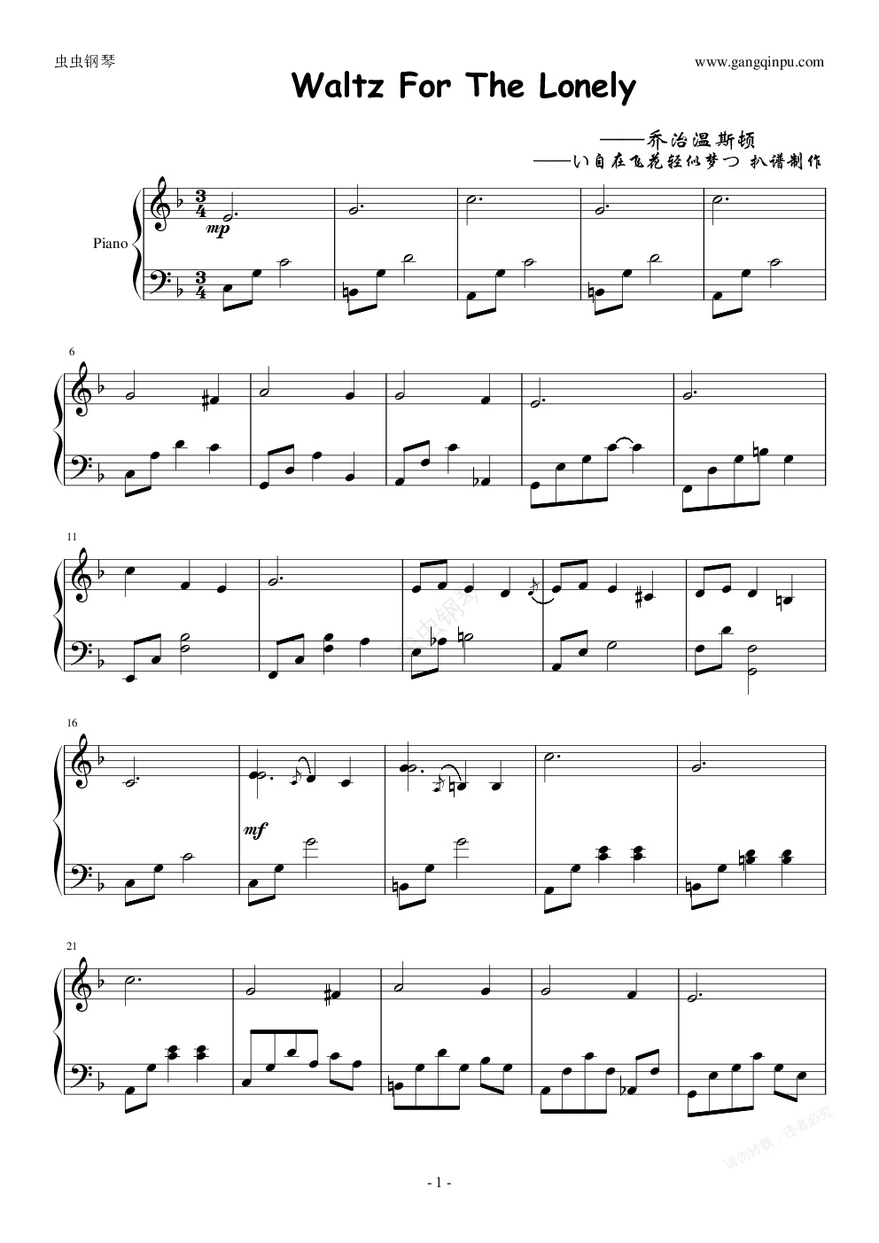 钢琴谱:孤单华尔兹