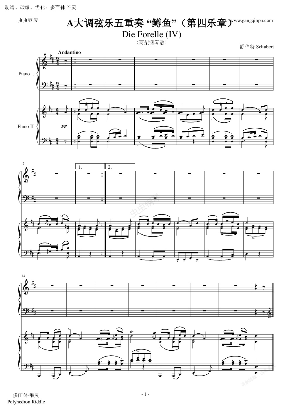 钢琴谱:A大调弦乐五重奏“鳟鱼”第四乐章(两架钢琴谱)