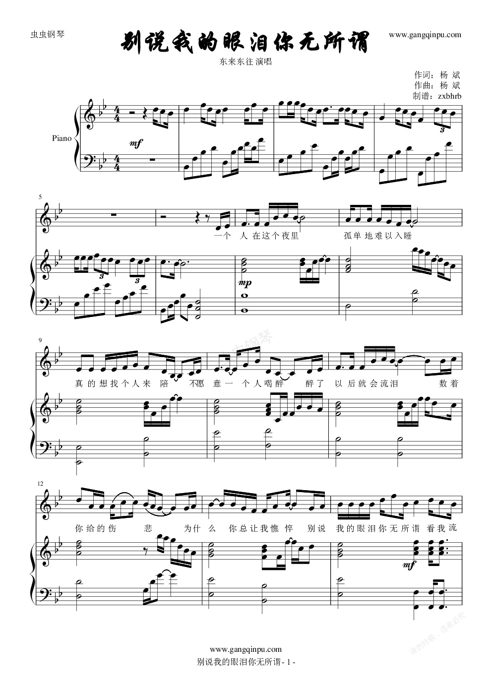 钢琴谱:别说我的眼泪你无所谓