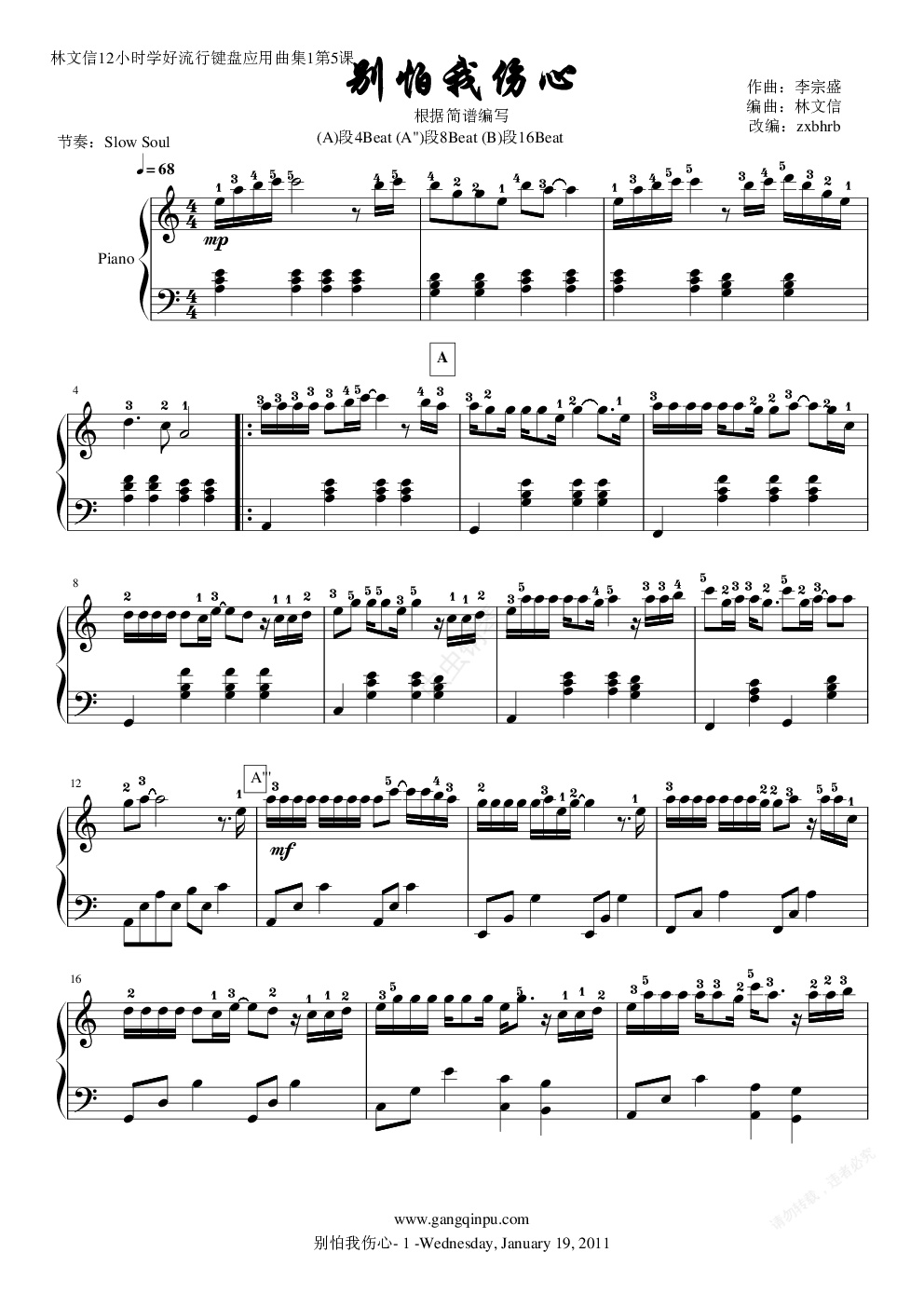 钢琴谱:《别怕我伤心》