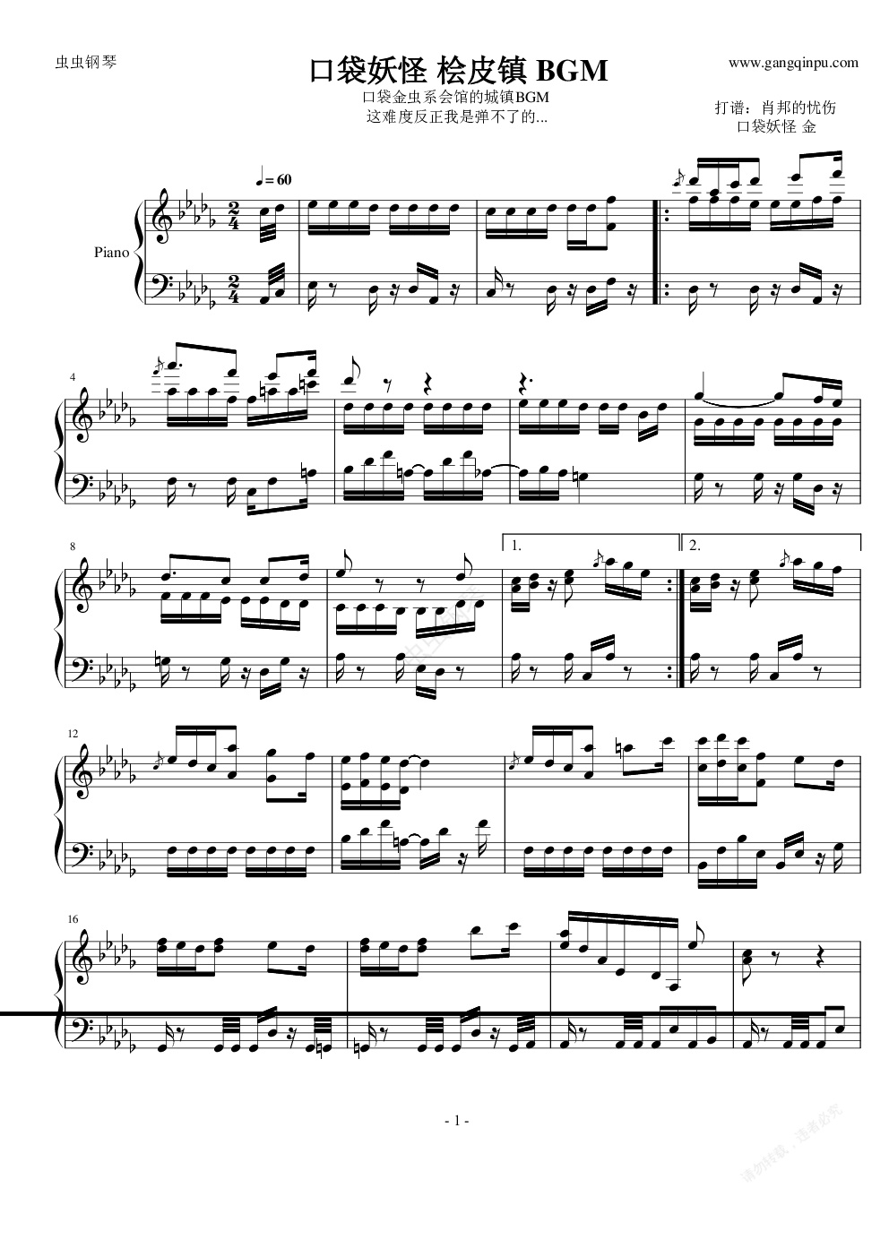 钢琴谱:口袋妖怪 桧皮镇 BGM