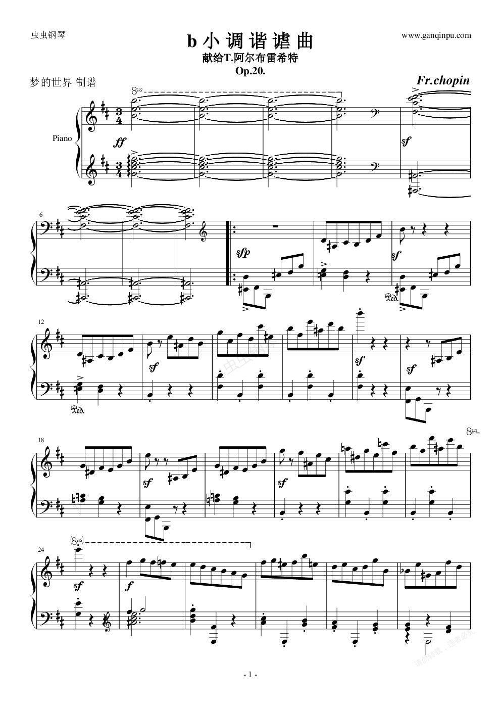 肖邦的谐谑曲是音乐形象对比鲜明结构庞大的一种单乐章的钢琴独奏曲。是肖邦无处可逃的热情和幻想的产物。他把这种从属于其他体裁的形式发展成独立的乐曲形式。这些谐谑曲已不同于以往的谐谑曲体裁,不再限于嬉戏、玩闹而是隐含了深刻而复杂的思想内容。四首谐谑曲,特点各不相同。一般认为这些作品是简单的三段体,包含一段谐谑曲和与之形成强烈对比的中段。