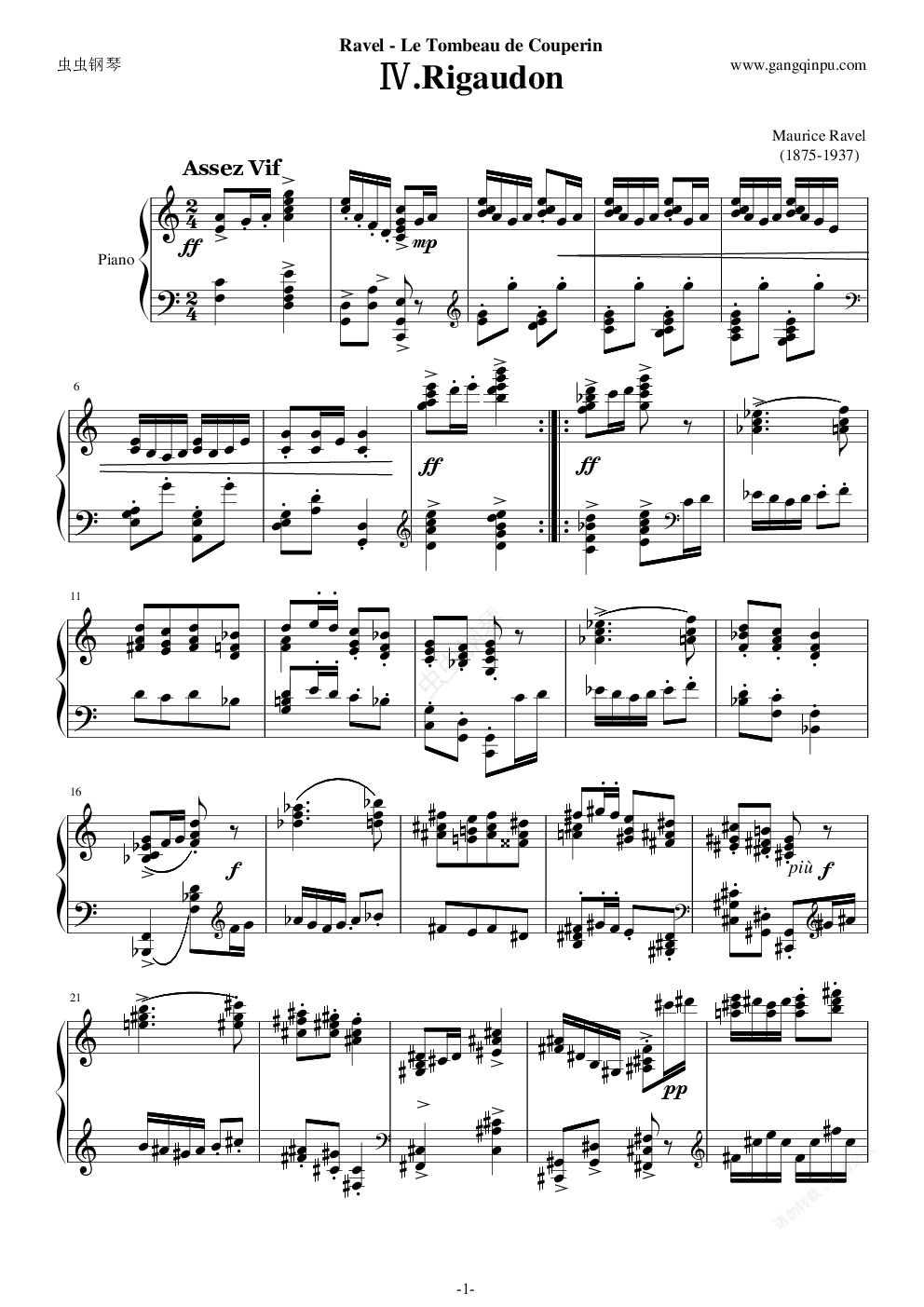 这里是第四首《利戈顿舞曲》(纪念巴斯卡·果丹·皮厄尔兄弟 To the of and)利戈顿舞曲原是法国南部普洛旺斯的民间舞曲,节奏活泼生动,18世纪曾流行于欧洲各国。拉威尔创作的这首乐曲有民歌风的旋律,和声却有自己的特点,十分丰富多彩。