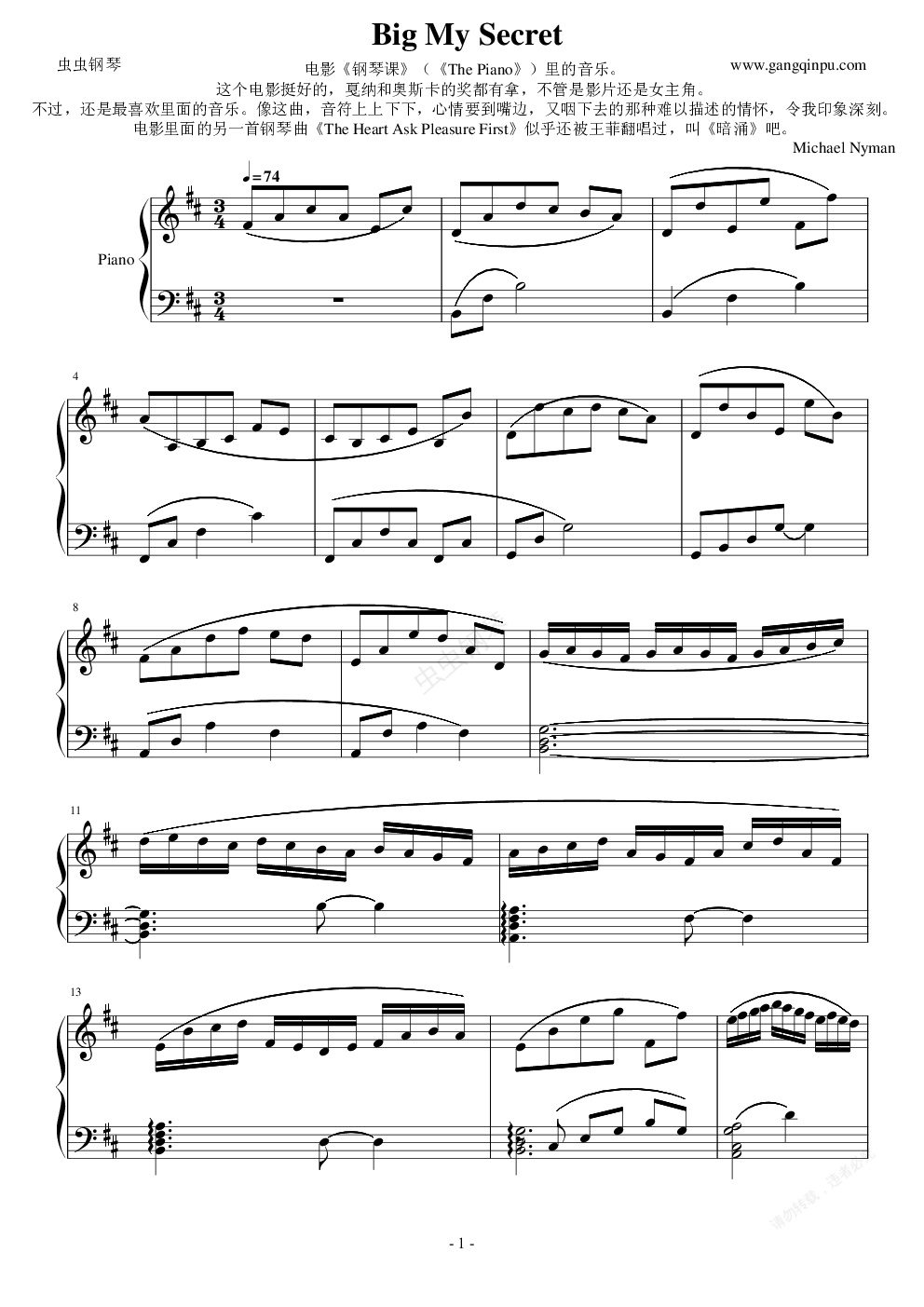 实在喜欢这类的音乐啊~不过呢,因为习惯背着弹,这个曲子就不太好下手了。旋律似乎因为很好听,应该很好背的感觉。但是弹的时候才发觉,上下行很多,而且跨度有时2,3度,有时候4,5,6度都有,并且交错进行,就不太好背了。况且因为习惯了首调式,对这个D调谱面的又不太好下手····于是就先把乐谱打出来,算是熟悉乐谱——时常这样做的——后来发现虫钢上似乎没有《The Piano》的乐谱,就放上来了,希望大家喜欢。