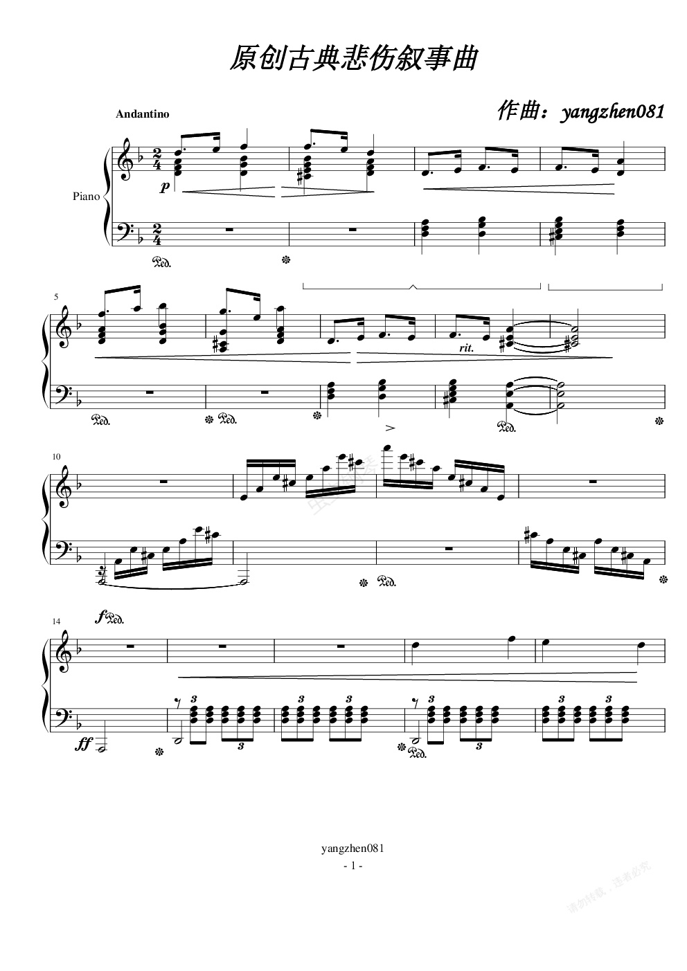 钢琴谱:原创悲伤叙事曲
